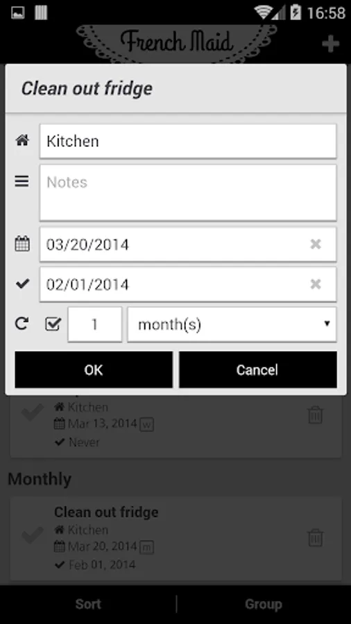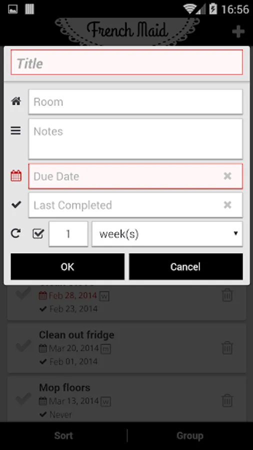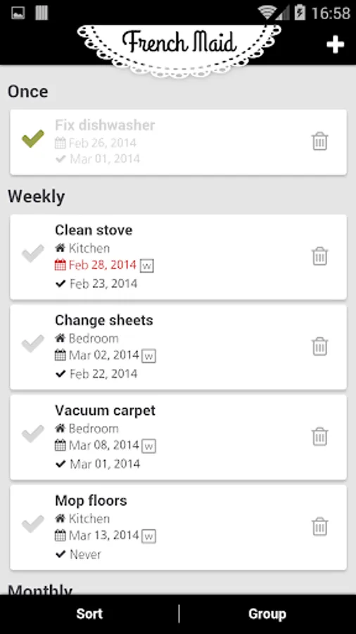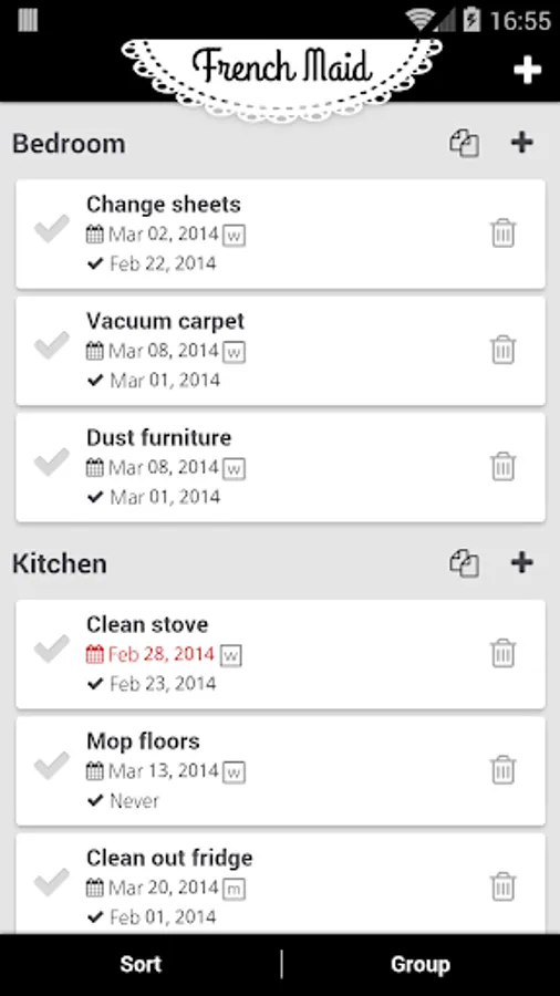 French Maid helps you keep your home clean and your mind clear. Capture chores and home maintenance tasks in a single app and free yourself from inconveniently-timed "I really should clean that..." thoughts. French Maid keeps track of what needs to be done and when, and shows you when a chore was completed last. Simple task creation and bulk copying make building a comprehensive house cleaning checklist quick and easy.