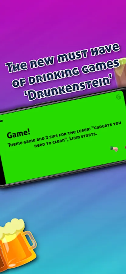 Enter the names of your fellow players and let the party begin. "Drunkenstein" tells you what to do. There are several categories, including: "Normal", "Game", "Virus", "Bottoms Up" and "Minigame", which will be randomly selected for you. If you're good, your teammates will have to drink a lot, if you're not, you'll get your ass kicked.