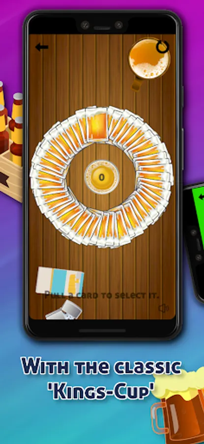 Randomly lay out cards in a circle around a cup (you need a real cup). In turn, all players draw cards, each card has a property that must be followed. If a king is drawn, that player must tip a sip of his drink into the center cup. If a player draws the 4th and thus the last king, the game is over and the player must drink the cup in the middle. Bottoms Up!