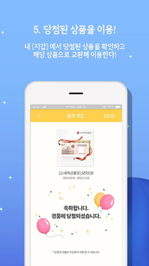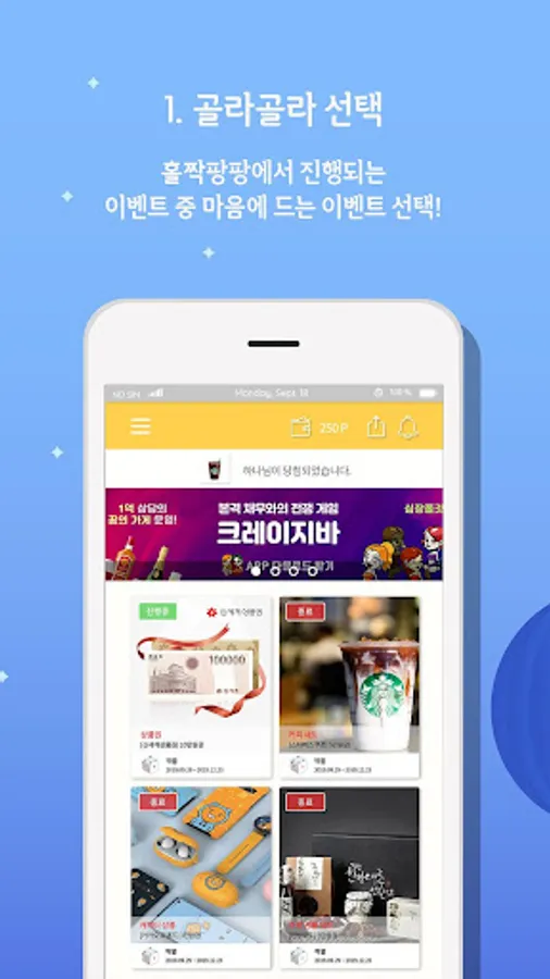 You can receive GIFTICON-Coffee / Beverage, Pizza / Chicken, New World Gift Certificate, Bakery etc.