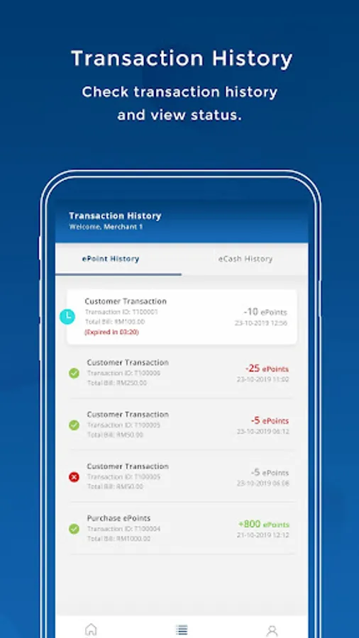 View eCash and ePoint transaction history including top up of ePoints.