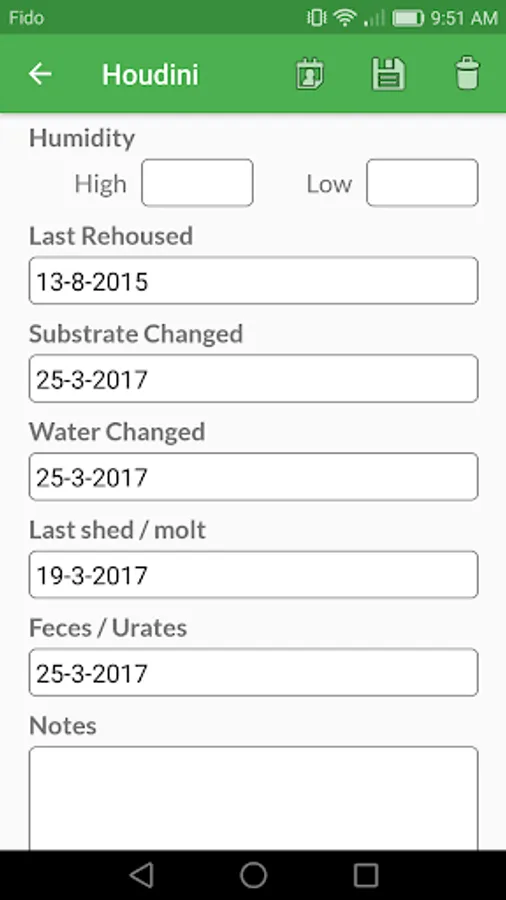 Enter and edit all aspect of pet care including: Feeding, shedding, substrate change, water change and more!