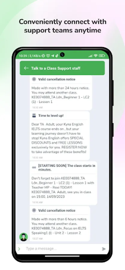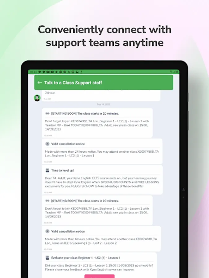 - Conveniently connect with support teams anytime and anywhere and receive notifications from Kyna English.