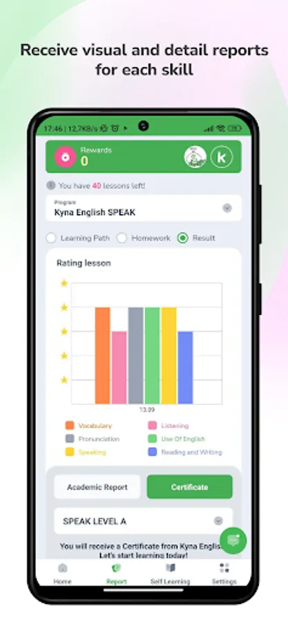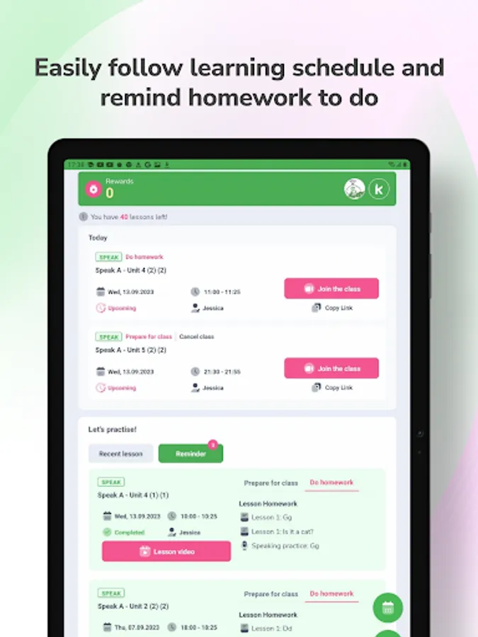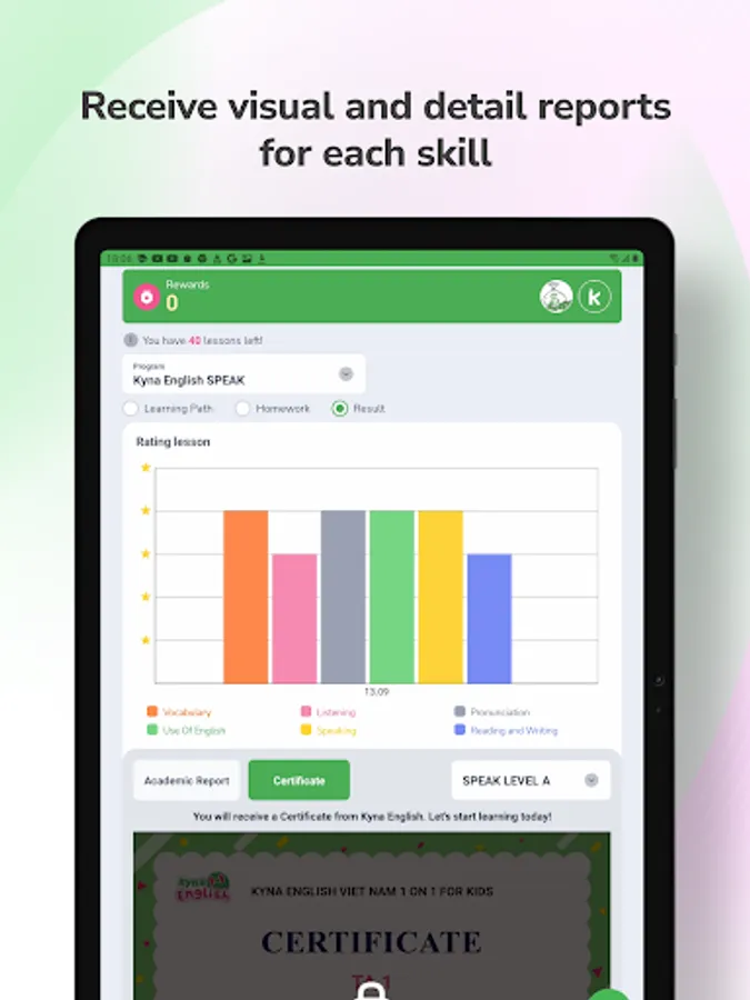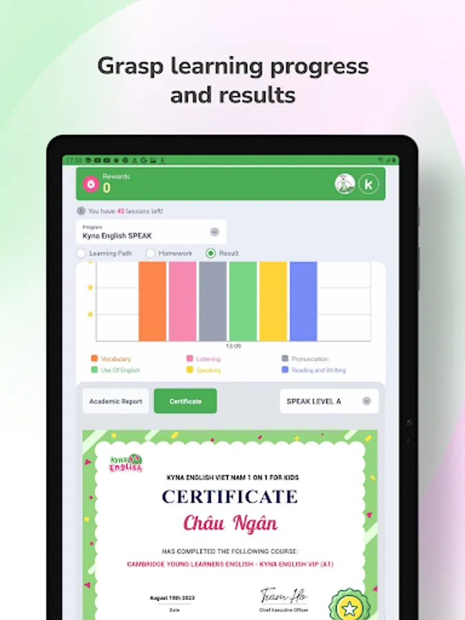 - Easily follow learning schedule and remind homework to do; grasp learning progress and results; receive visual and detail reports for each English skill;