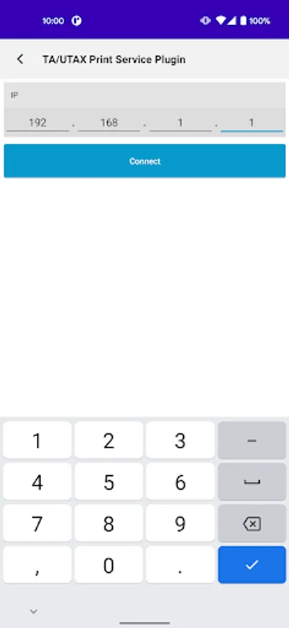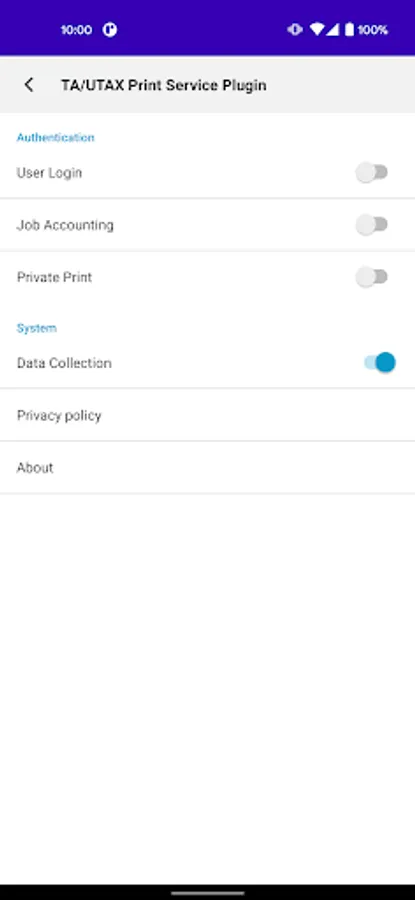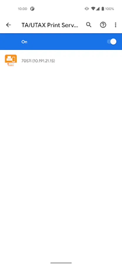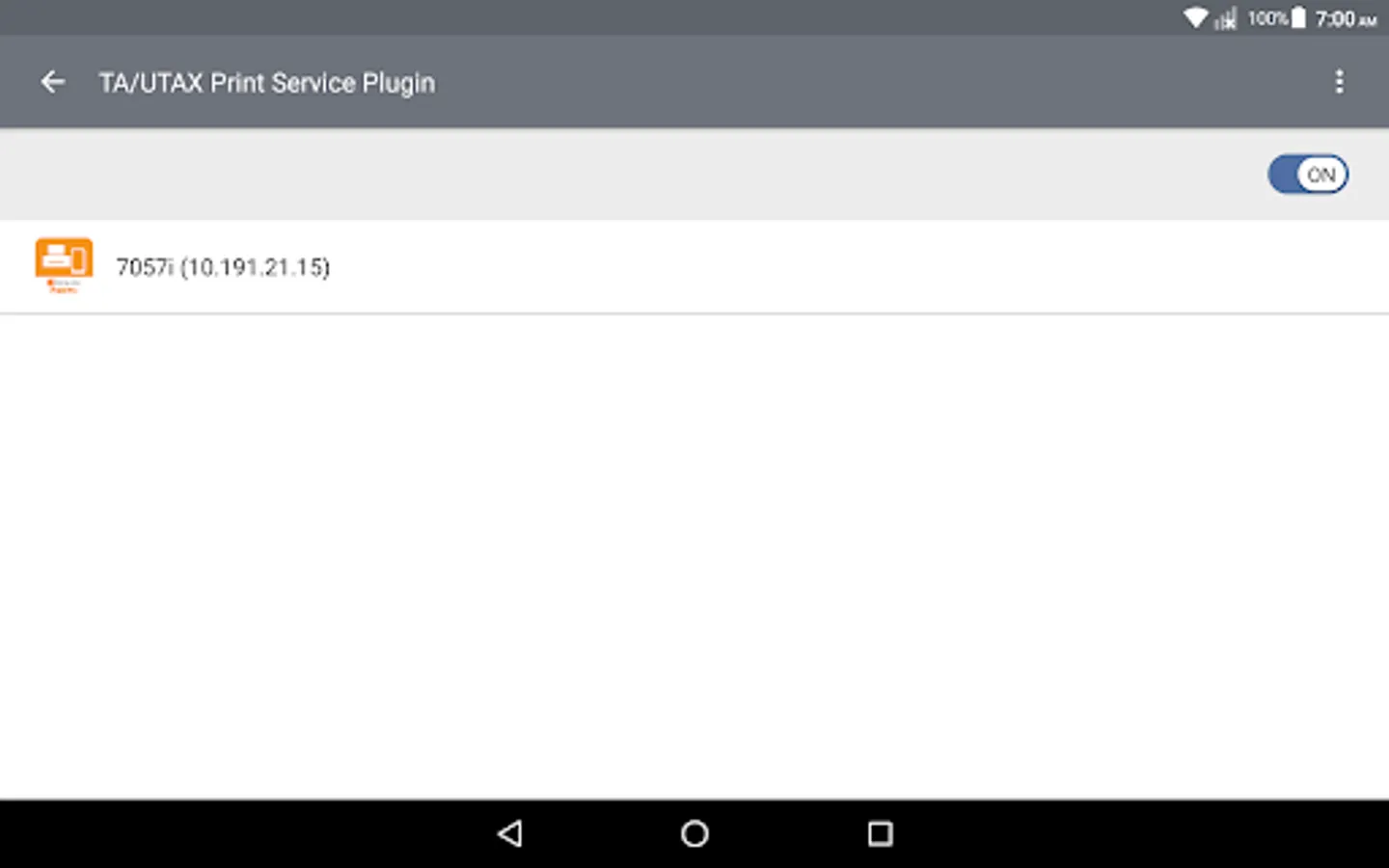 After installing the TA/UTAX Print Service Plugin, turn it on by going to Settings > Printing > TA/UTAX Print Service Plugin, and then toggle the setting to On. Discovered and manually added printing devices can be selected for printing from any applications where the Print option is available.