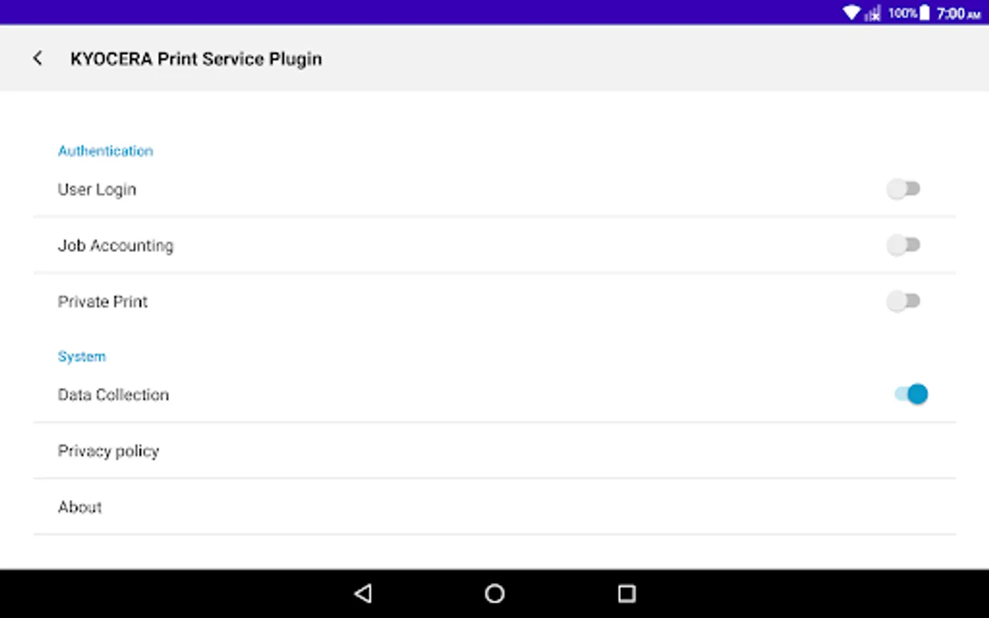After installing the KYOCERA Print Service Plugin, turn it on by going to Settings > Printing > KYOCERA Print Service Plugin, and then toggle the setting to On. Discovered and manually added printing devices can be selected for printing from any applications where the Print option is available.