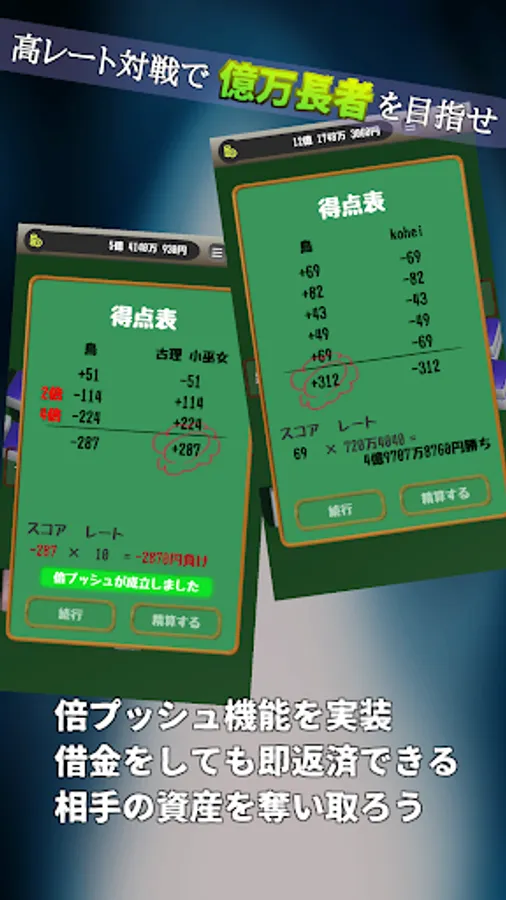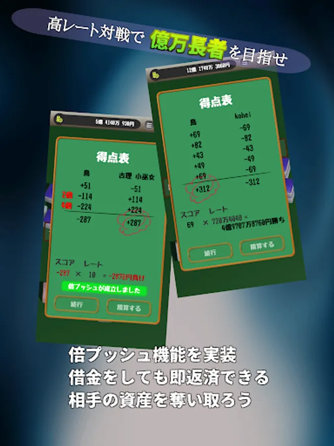 ・ The score calculation is the same as normal mahjong, and less than 1000 points are rounded up.