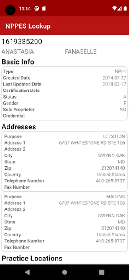 This app accesses the NPPES directory to return information for any provider registered to the directory. Search via NPI. Supports both type 1 and 2 NPIs.