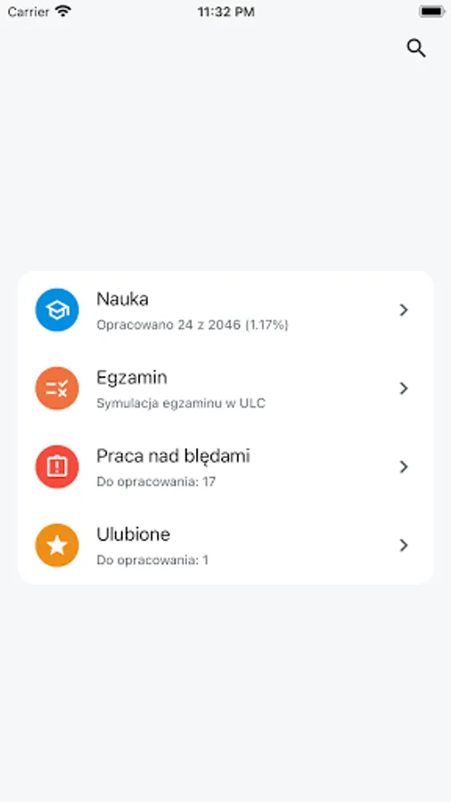 3. W trybie nauki możesz odpowiadać na pytania z osobnych przedmiotów lub przypadkowo wygenerowane pytania ze wszystkich kategorii;
