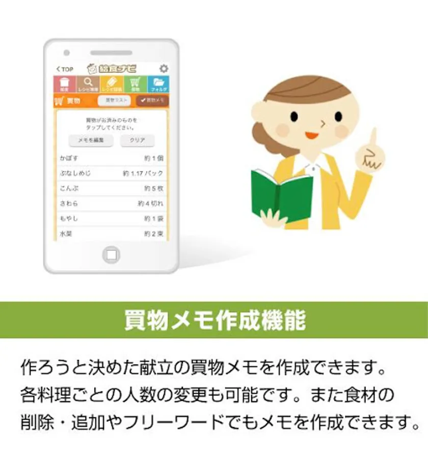 You can create a shopping memo of the menu, which decided to make. Changing the number of people in each cuisine is also available.