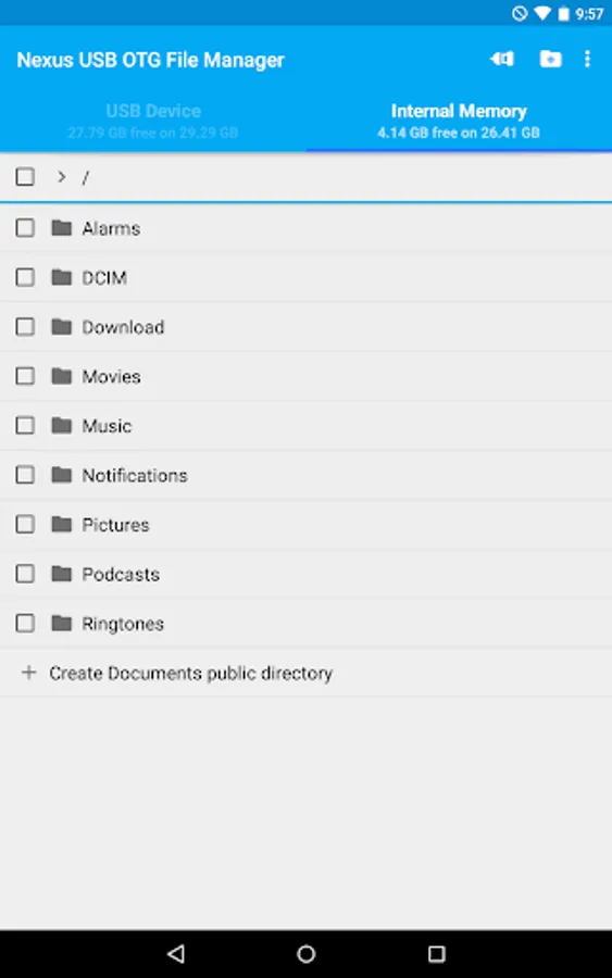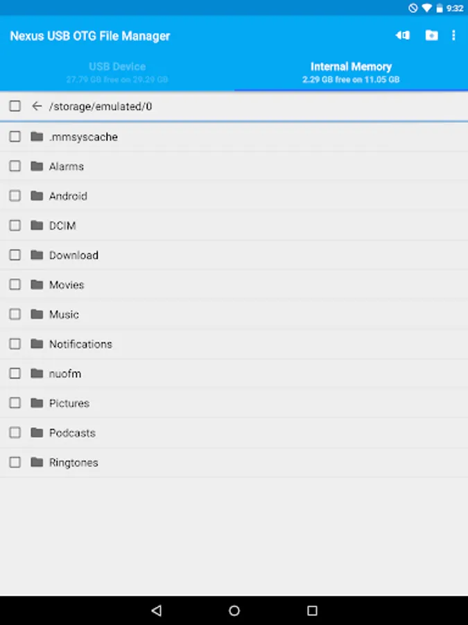 USB OTG File Manager for Nexus now includes an "Advanced Mode" which allows you to access to all the files of your device. You can now create files and directories outside of the official Android public directories. This is for advanced users only!