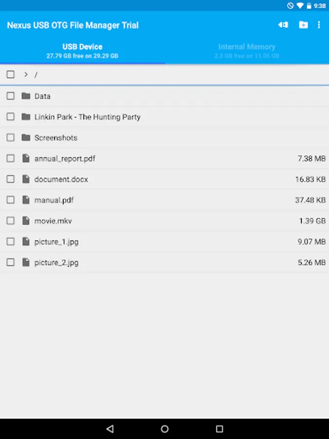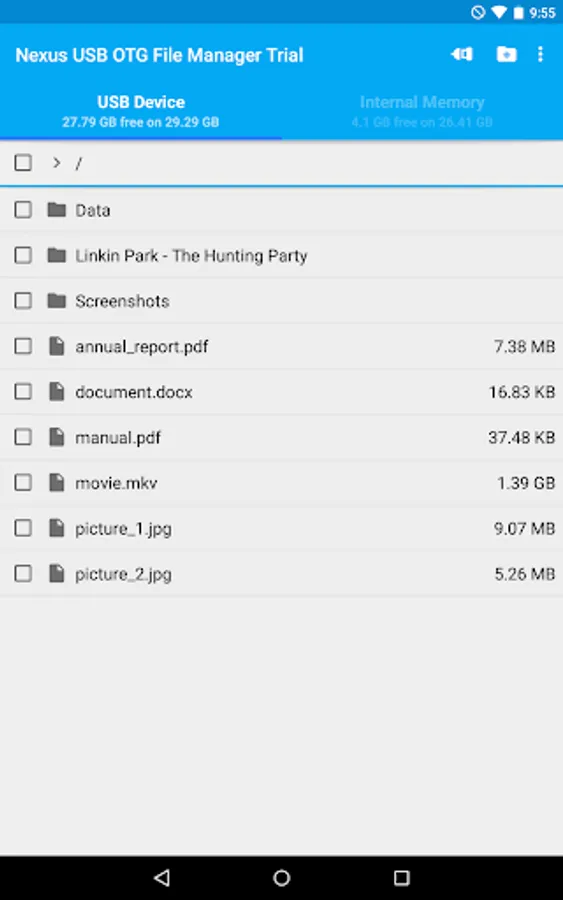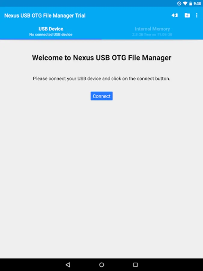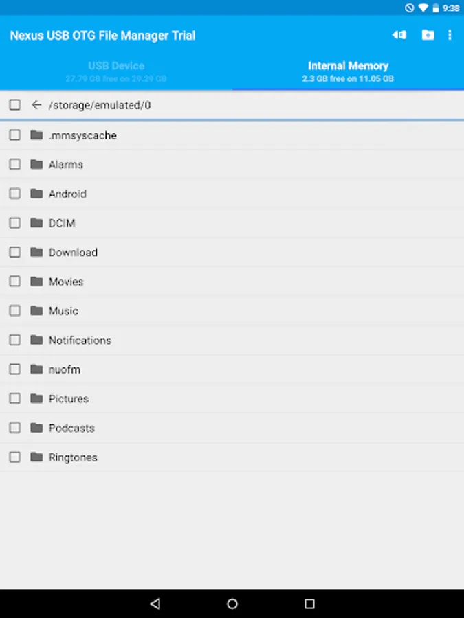 This is the free trial version of USB OTG File Manager for Nexus. You can test all functions on your USB device except the file copy and the file opening which have been disabled.