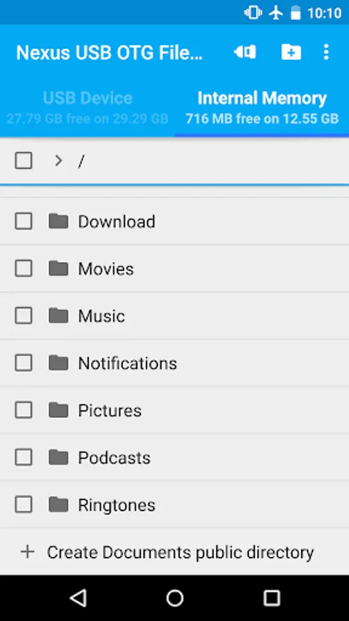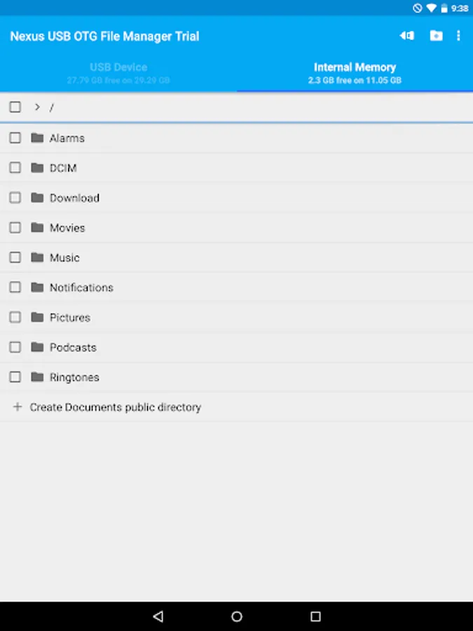 USB OTG File Manager for Nexus now includes an "Advanced Mode" which allows you to access to all the files of your device. You can now create files and directories outside of the official Android public directories. This is for advanced users only!