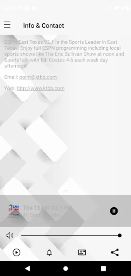 92.1 FM The TEAM Sports Radio is East Texas’ only media outlet that is dedicated fulltime to sports. The TEAM is home to SportsTalk with Bill Coates, the area’s longest-tenured radio program. In addition to its strong local presence, The TEAM is also the East Texas home of the biggest names in national sports broadcasting including Dan Patrick, Clay Travis and Colin Cowherd. The TEAM is the East Texas flagship station of Texas Rangers Major League Baseball, the University of Texas Longhorns football, Texas Tech Red Raiders football, Tyler Junior College football and basketball and Texas A&M Aggies football.