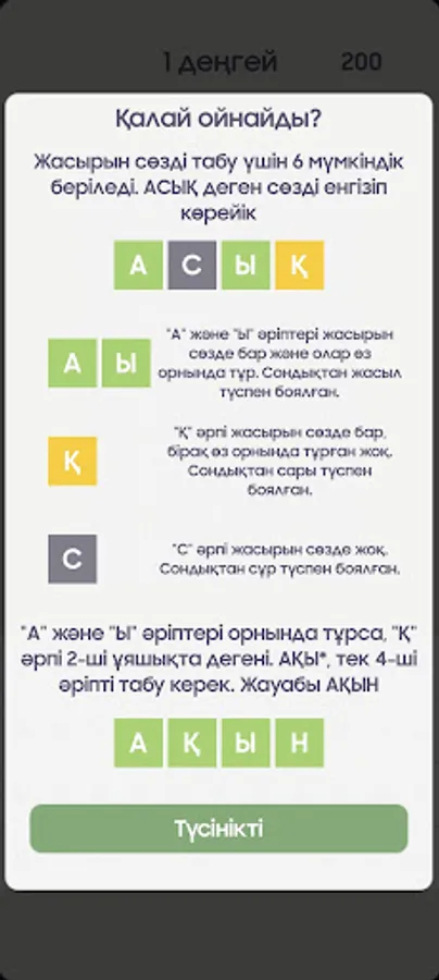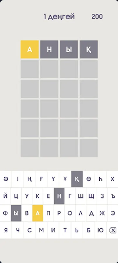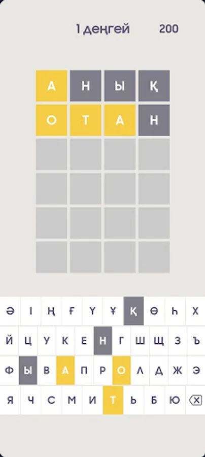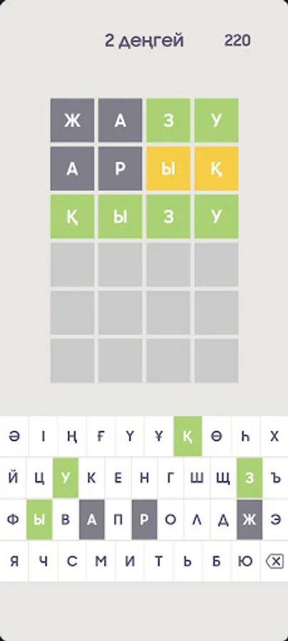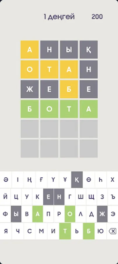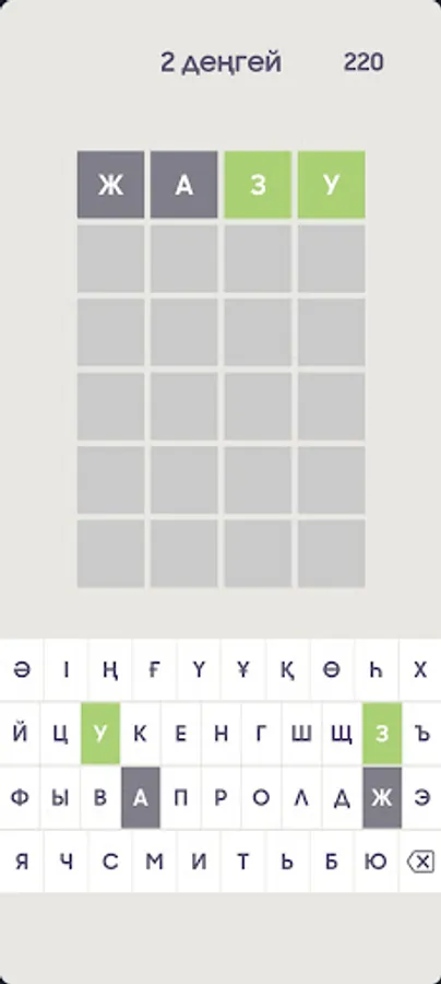 You will be given 6 chances to find the hidden word. You need to enter words that exist in the Kazakh language and find the answer.