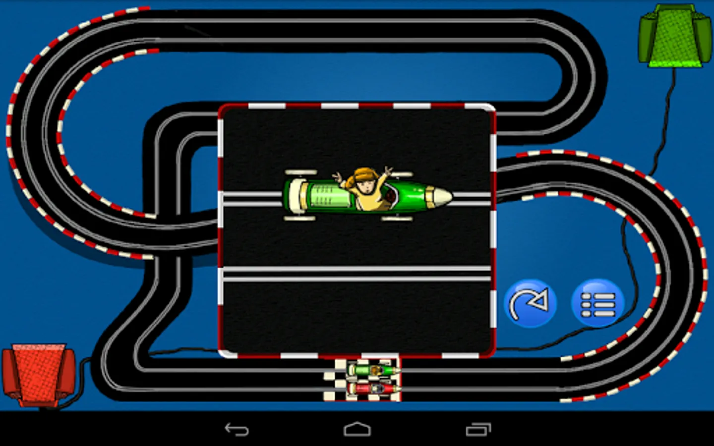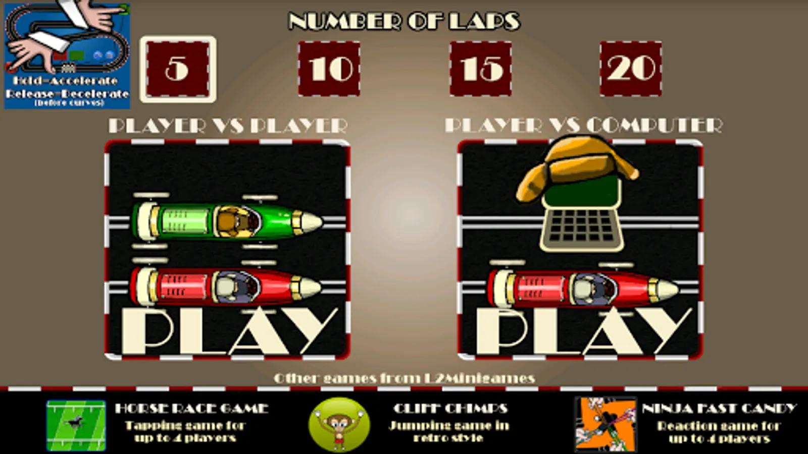 Single player mode - play 5, 10, 15 or 20 laps (with increasing difficulty) against the computer and feel the adrenaline rush as the computer drives faster every lap.