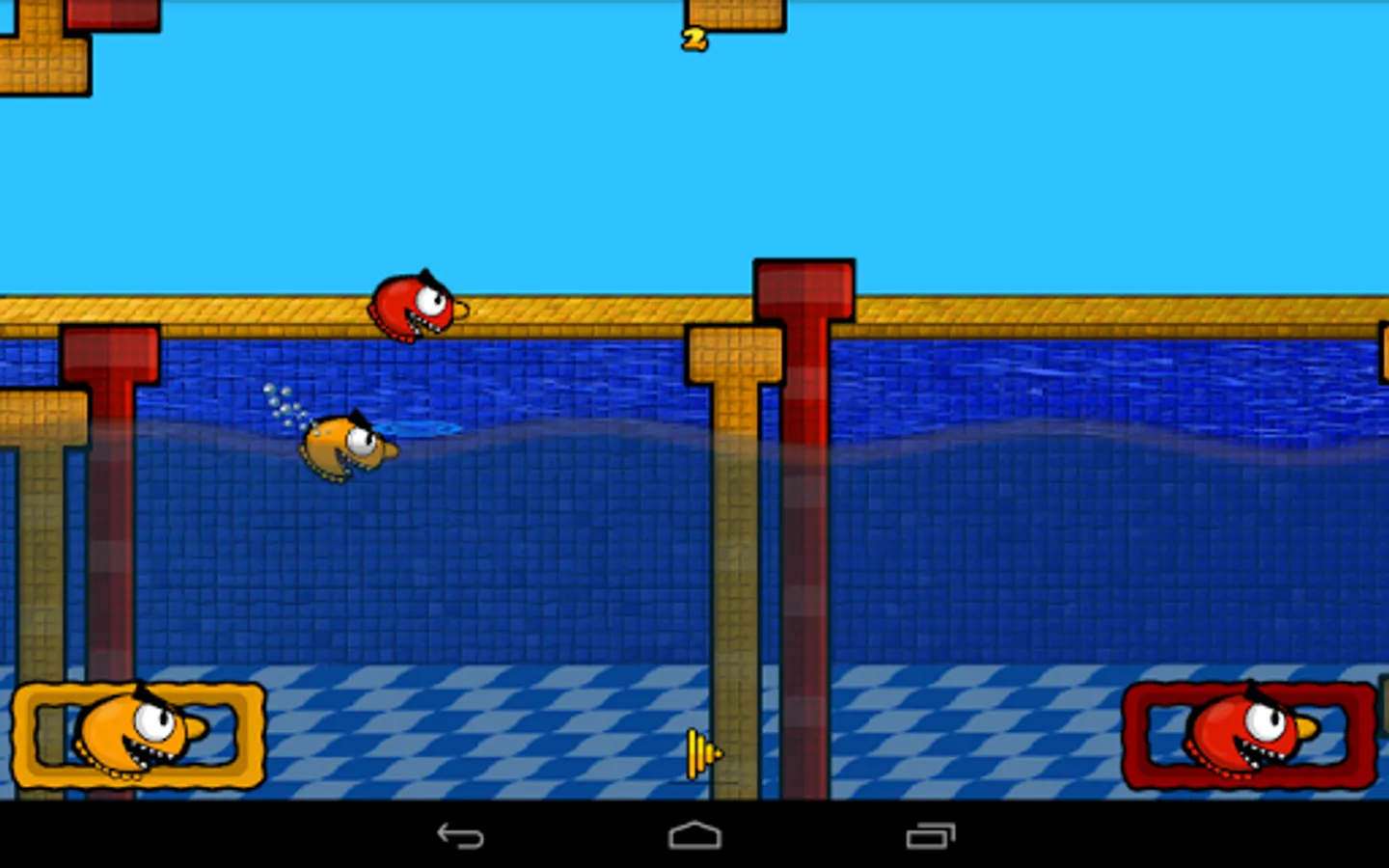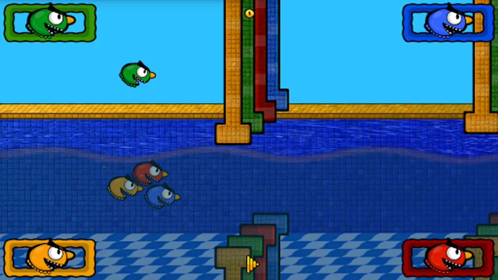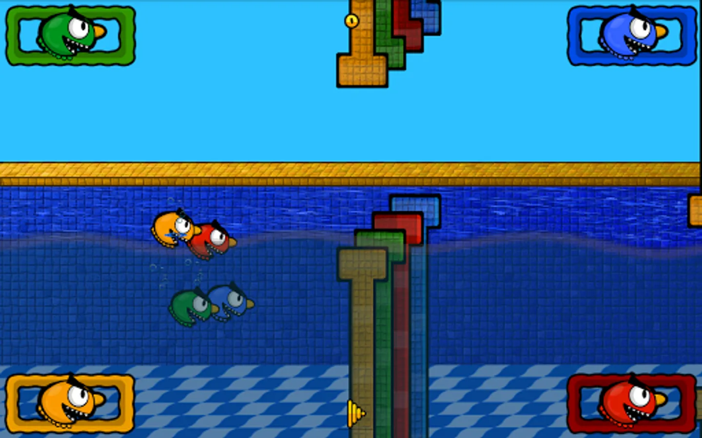 Tap a corner of the screen and move your fishy monster Between the pipes with the same color.