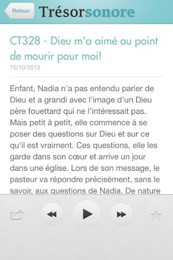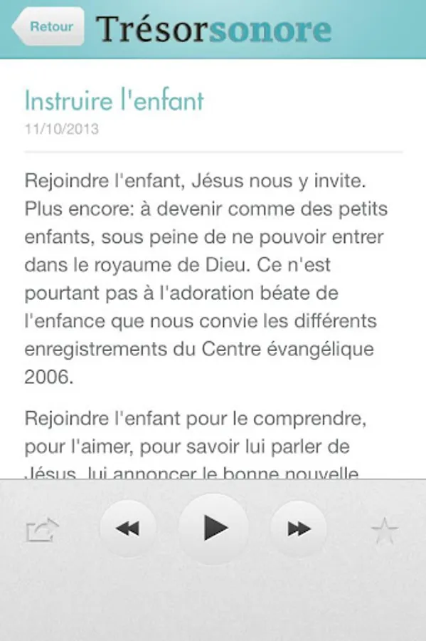 On Tresorsonore Discover thousands of free connection with the Christian faith records: messages, conferences, testimonies, radio ... and many others. Find example every morning the "treasure of the day", a short daily meditation.