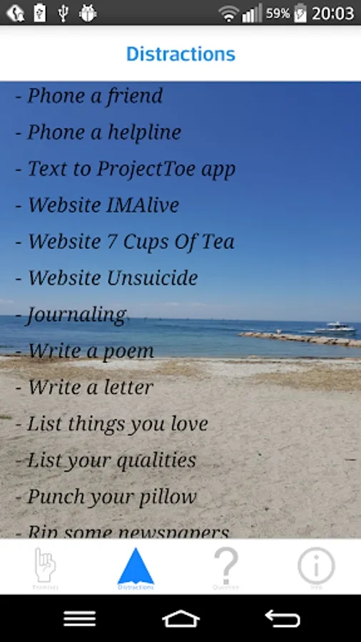 The app includes a list of suggestions for different distractions that can be used in a time of need.