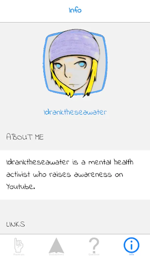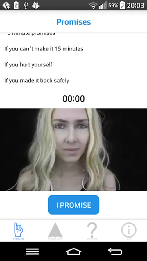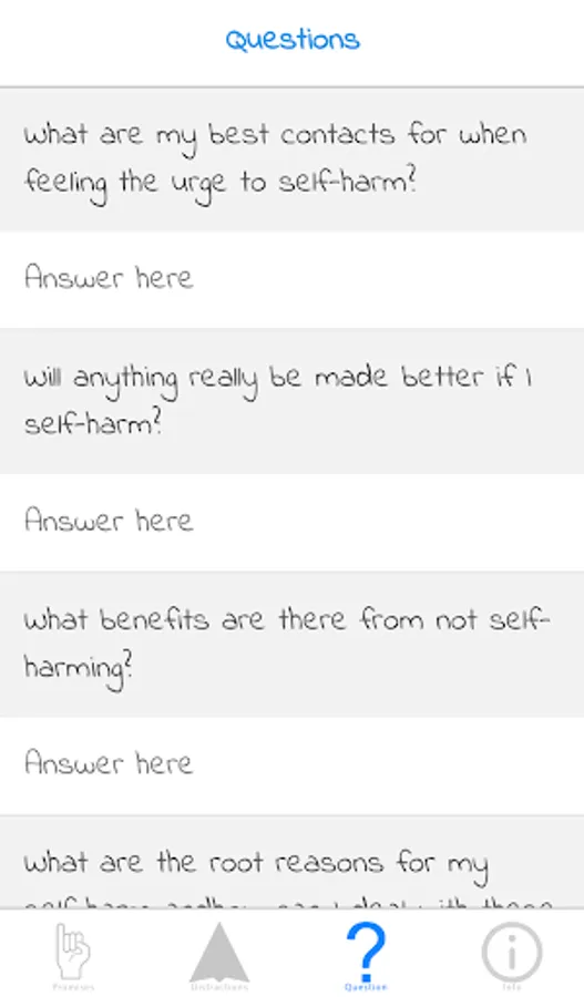 The “Self-harm" app has interactive options to play different videos that will guide someone through an urge, by asking them to promise for 15 minutes that they will not hurt themselves. It has options for if they can not promise and gives ideas on how to make it through. There are 4 different videos that can be played.