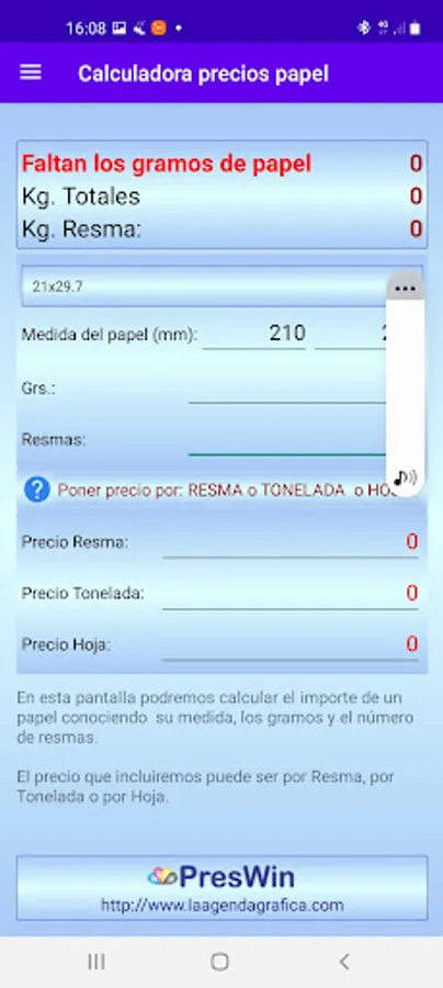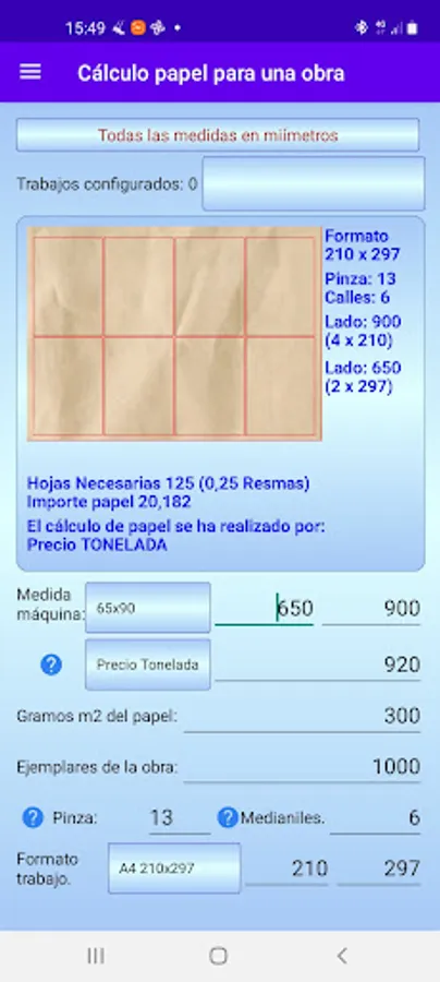-Calculadora de precios de papel, calcula el precio del papel a partir de una medida de Resma y el gramaje del papel.