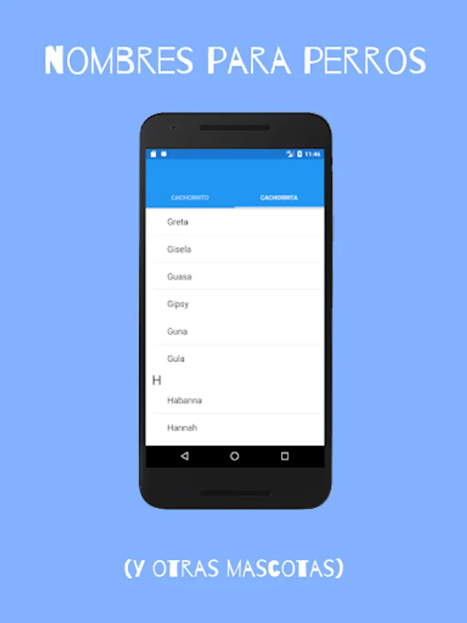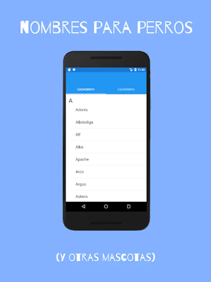 The app is divided into two tabs one for male puppies and one for female cachorritas. So you can easily find the right name depending on whether it is a dog or a dog or a cat or a cat. In addition, the names are listed alphabetically.