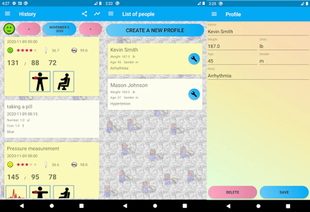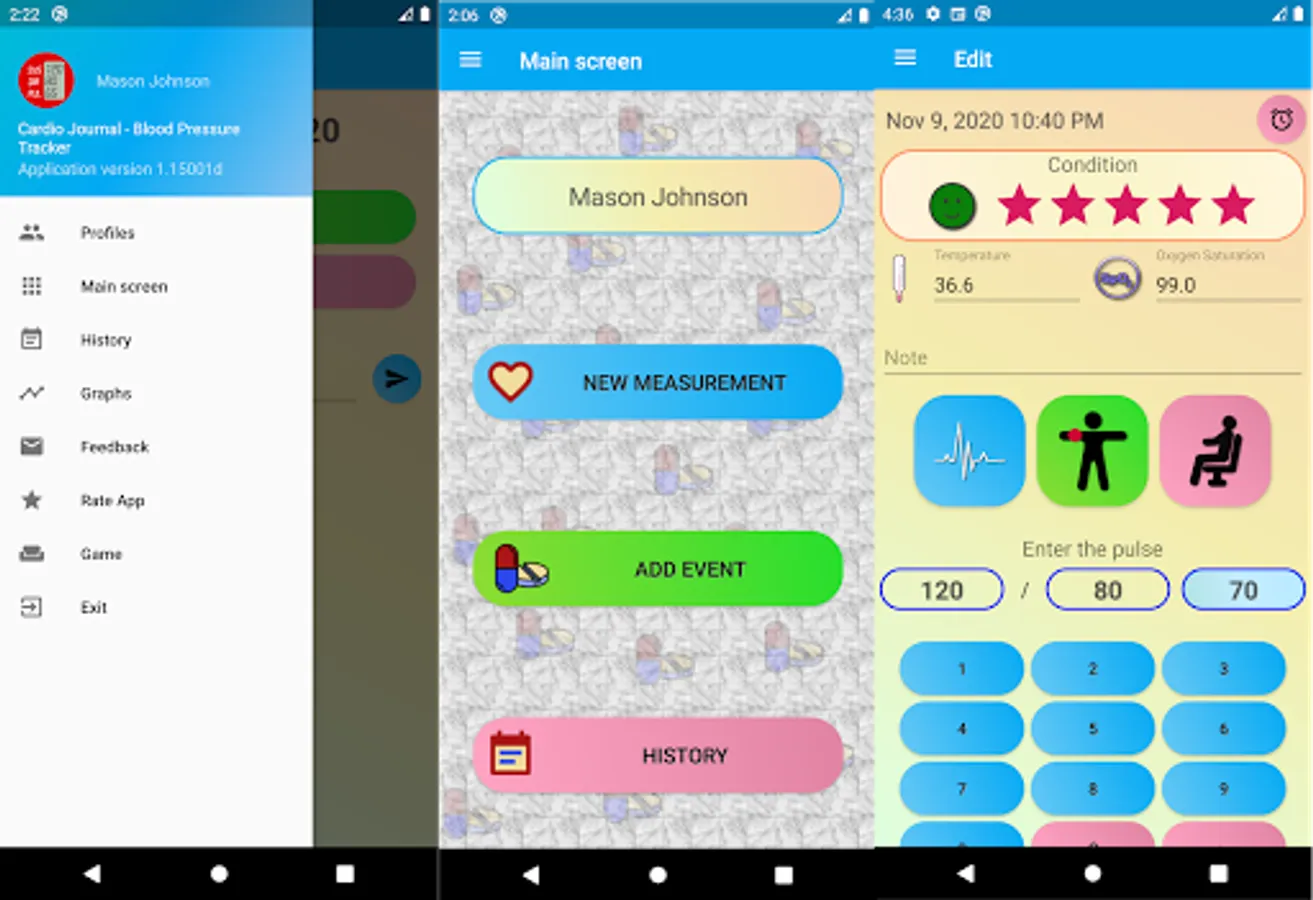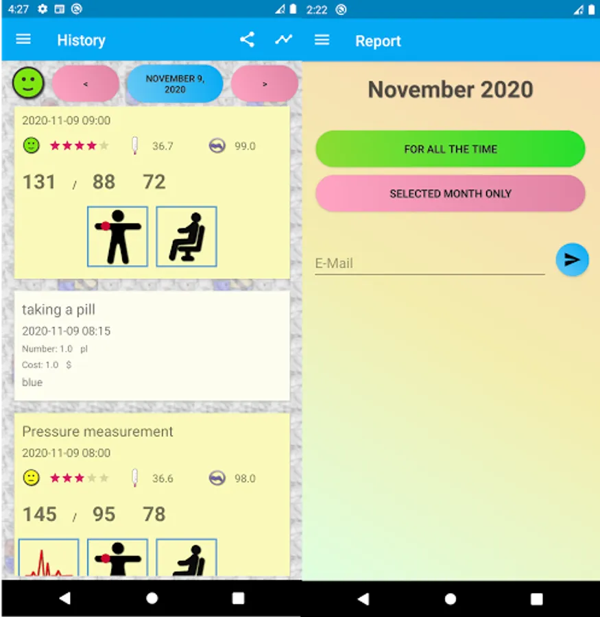 • Keep and edit a journal of vital parameters of human health - blood pressure and pulse, the presence of arrhythmia's, well-being, measurement position, hand - left or right. temperature, blood oxygen saturation.