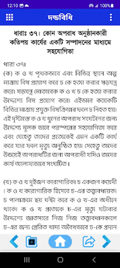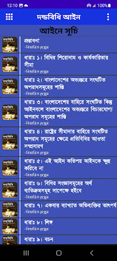 এই এ্যাপ্লিকেশনটির মাধ্যমে দন্ডবিধি সকল আইন জানা যাবে এবং যারা আইন নিয়ে লেখা পড়া করেন তাদের জন্য এটি সহায়ক হবে। এছাড়াও আইনগুলি সহজে মনে রাখার জন্য আইনের সুচি গুলি মুখস্ত করা সহজ হবে।