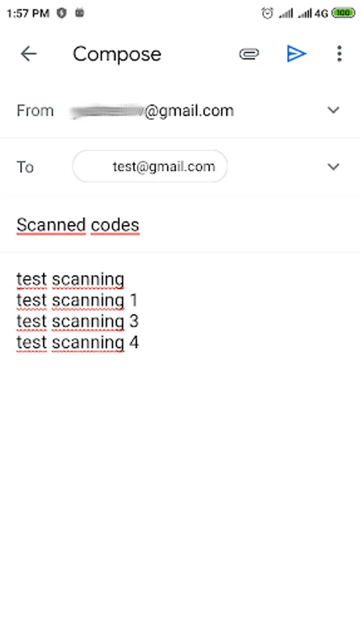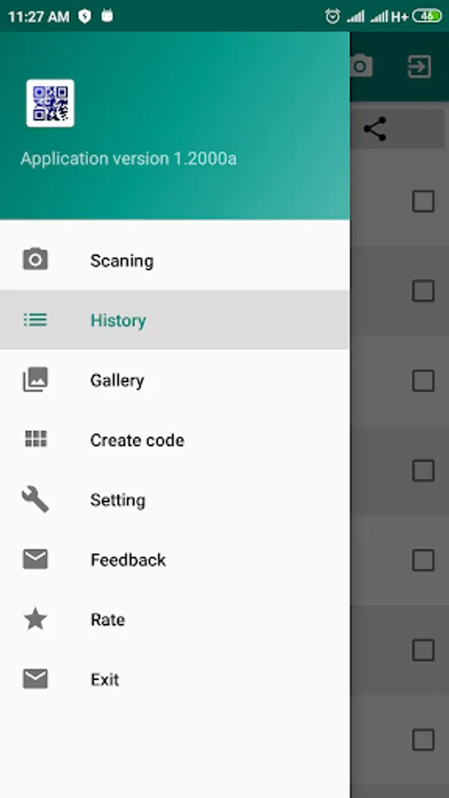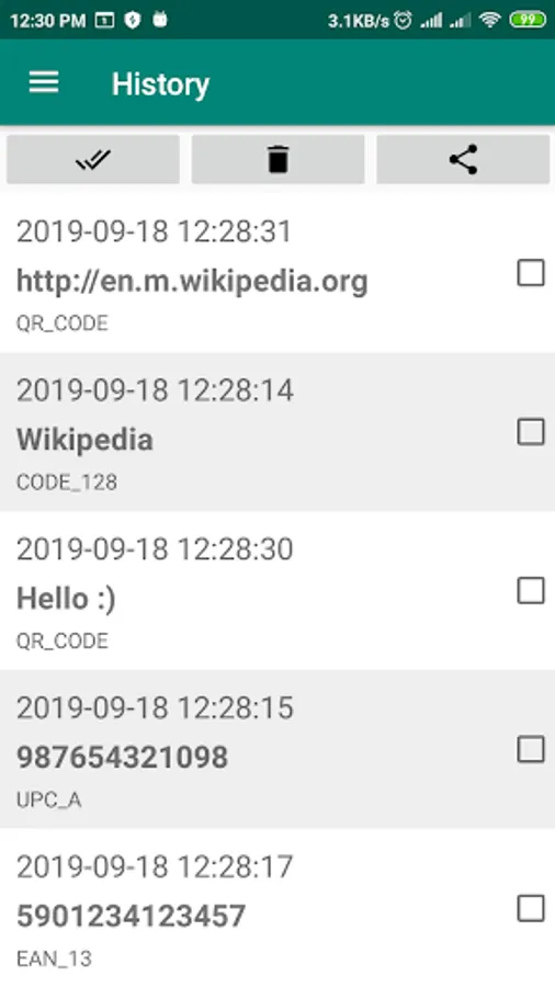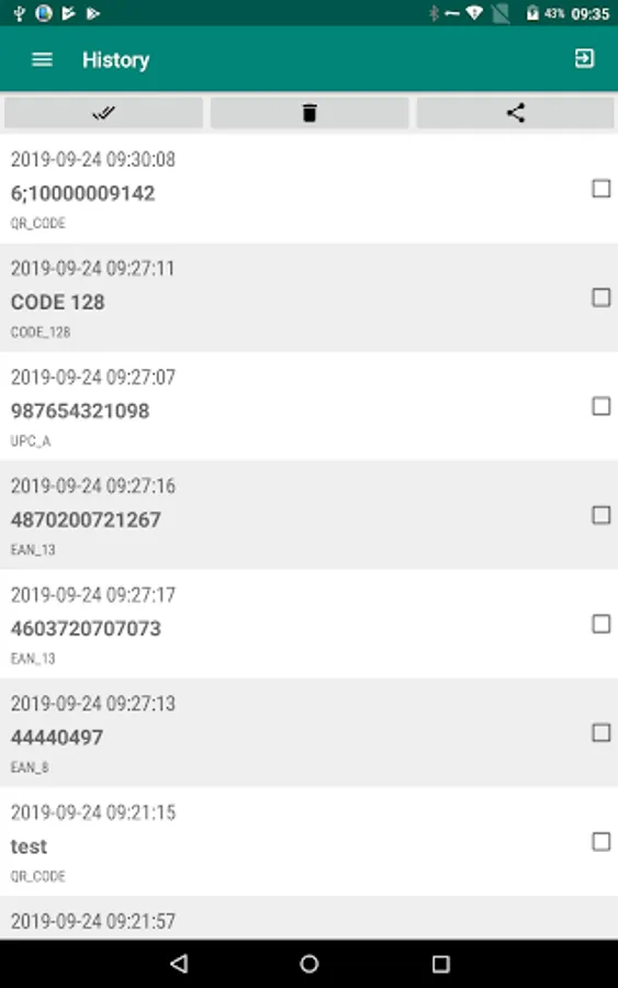 Previously scanned QR codes are stored in history, they can be selected and deleted or sent by e-mail.