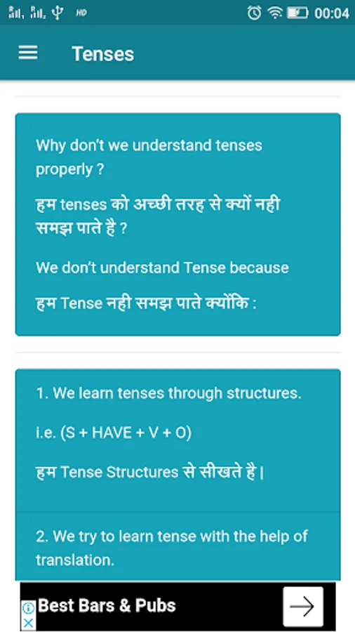 This app makes learning English easy by explaining in Hindi and English.