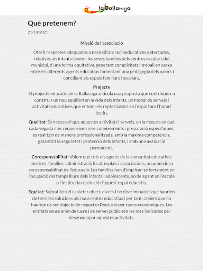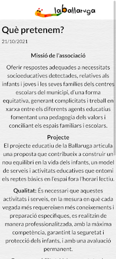 La Ballaruga (Associació Grup d'Entitats El Vendrell Educació i Lleure), neix com associated with the municipality of Vendrell l'any 2005, for the need of regrouping among the AMPA totes of the schools and institutes in a moment of strong demographic growth and growth. a high percentage of migrated population. Now, in order to collect the specific demands of family totes, sense excepció, and pose in common the treball esforç in the camp del lleure educatiu, in the extracurricular activities and in the socio-educational intervention projects of l'entitat We always have a main objective in respect of diversity, individual liberties, new development and social inclusion.