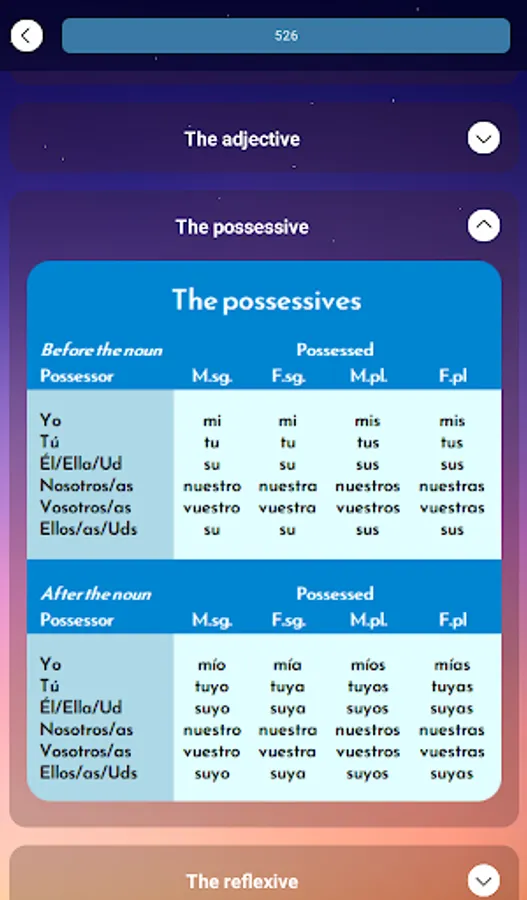 Our grammar tables will help you solve the exercises succesfully and will always be ready for you to consult. When you advance to a new level, the new vocabulary and sentences will be added to your personal glossary with its corresponding audio.