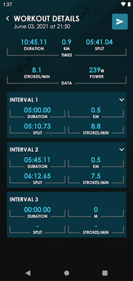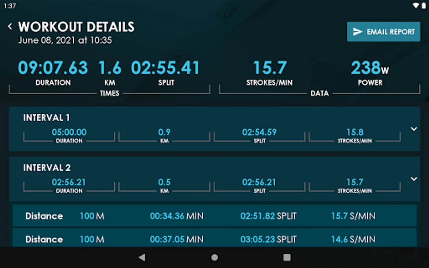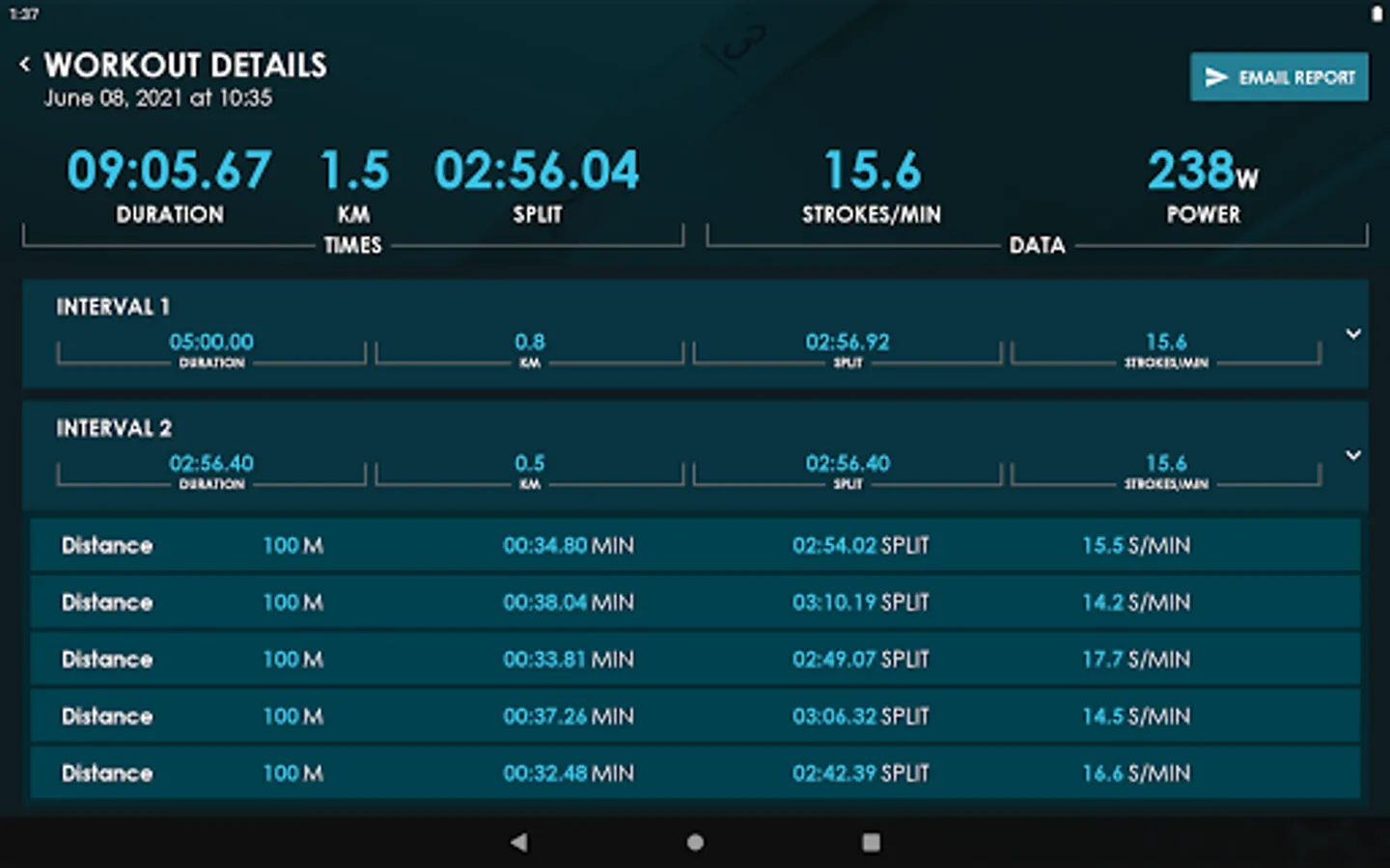 Each stroke of your workout is recorded and can be exported to your RP3 Rowing account on https://rp3rowing-app.com/ or shared by email directly with your coach. Go online to get a deep dive into your data or export it for further analysis.
