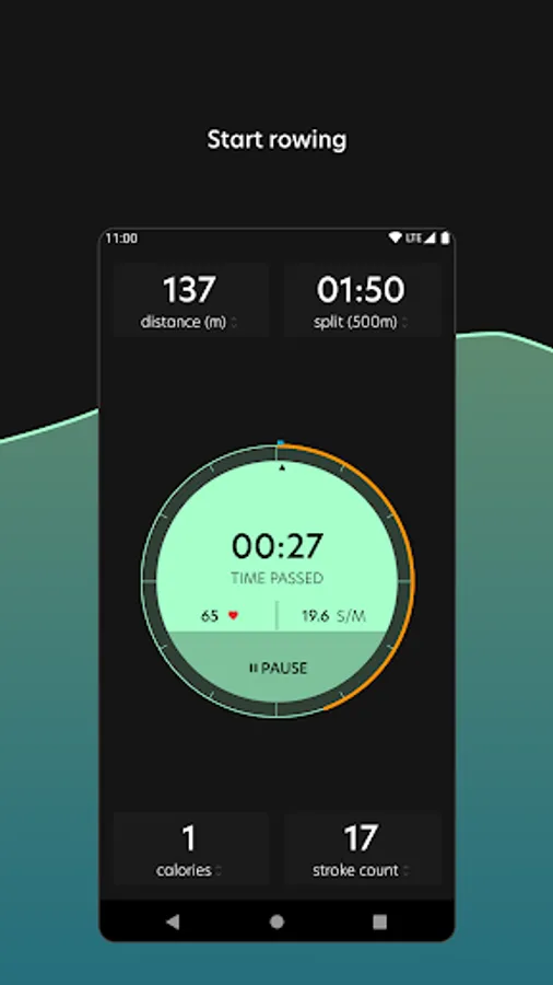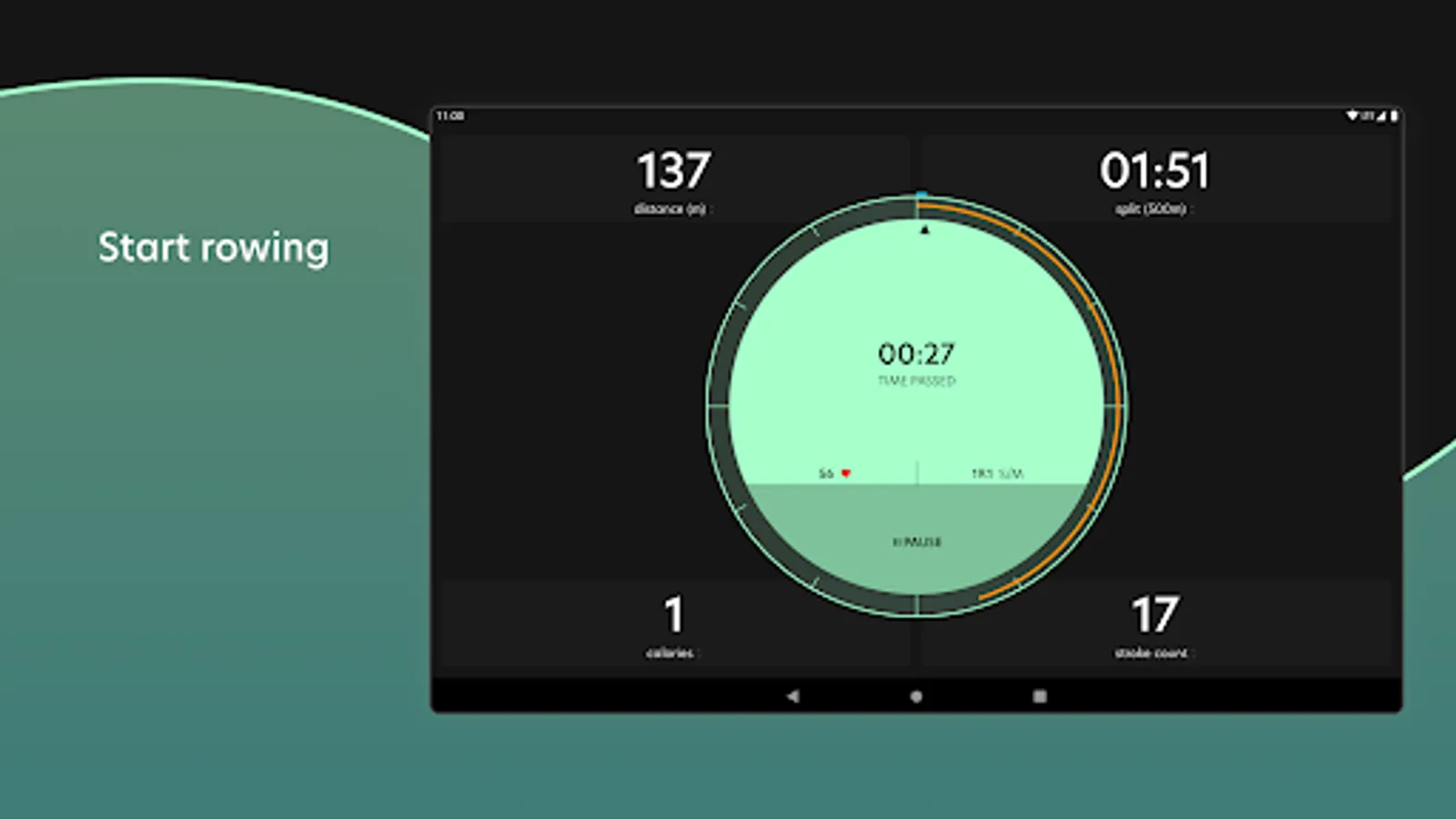 WaterRower Connect turns your Android device into a WaterRower performance monitor. View workout data in real-time as you row. Performance metrics displayed include Distance Rowed, 500m Split Time, Watts, Time and Stroke Rate.