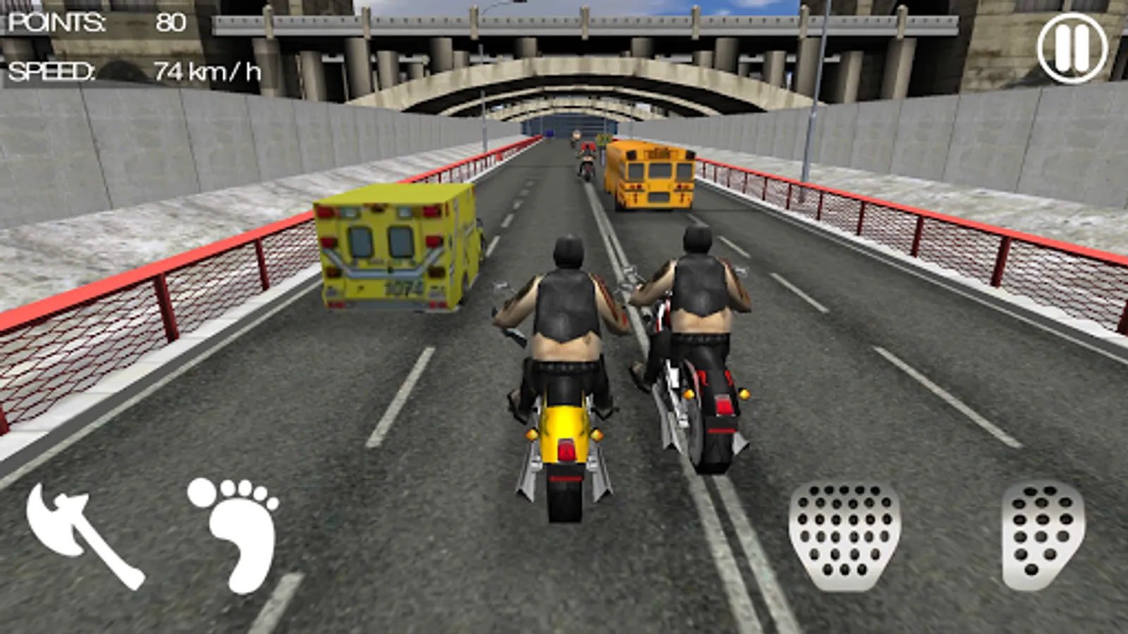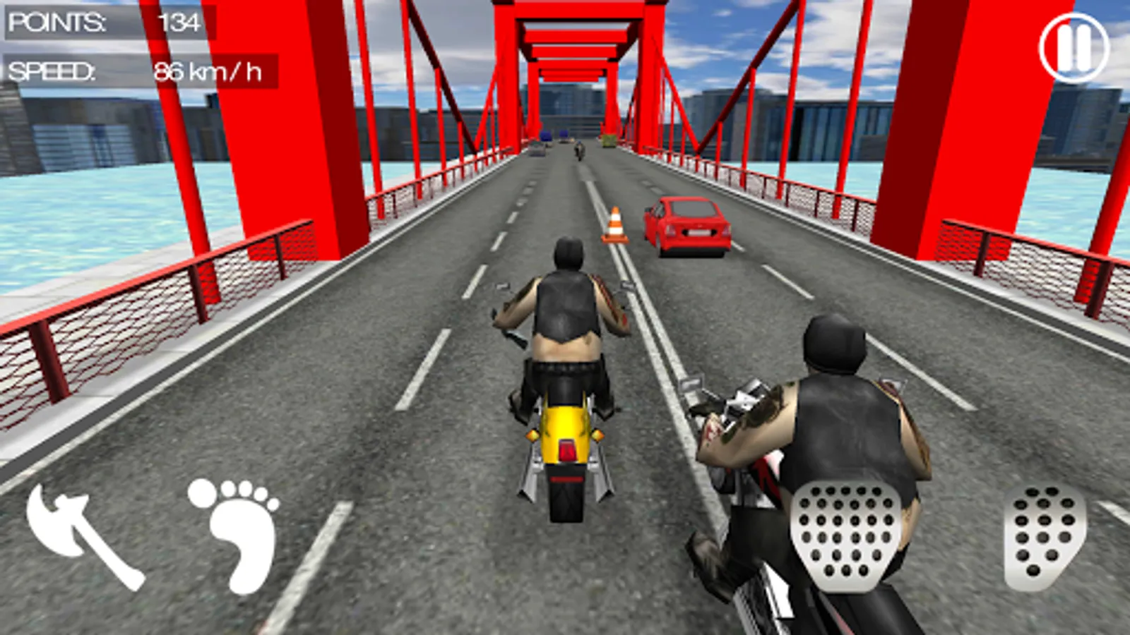 Race on motos through traffic and attack other bikers. Destroy as many other bikers as you can and buy better moto bikes.