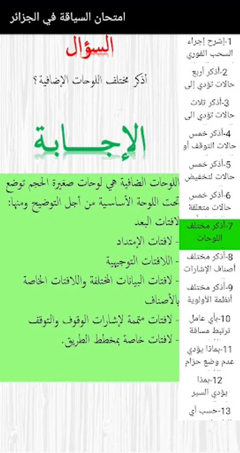1. Traffic Laws in Algeria: The application provides comprehensive information about traffic laws and traffic legislation in Algeria. You will learn about the main traffic rules and regulations, details of traffic signs, rights of way and proper behavior on the roads. This information is provided in a way that is easy to understand and apply.