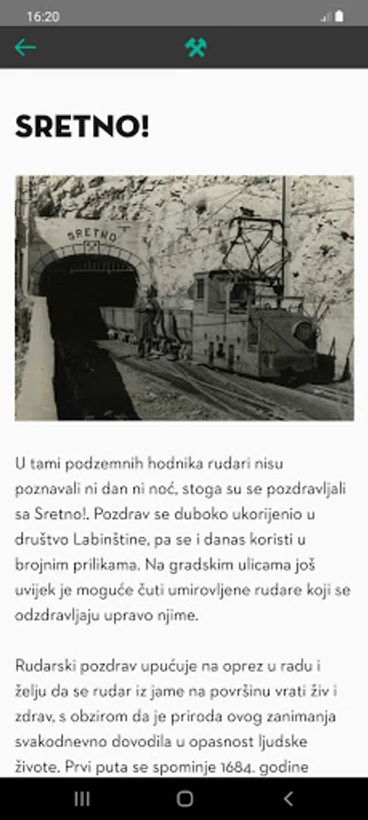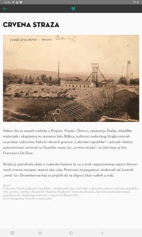 In addition to the visualization of the shaft, in this application you can find more information about mining in the Labin region, the famous strike of the Labin Republic and discover what black gold - coal meant for Labin then and today.