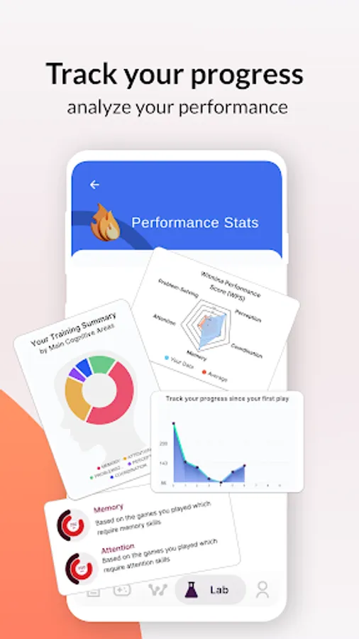 We analyze and interpret your cognitive performance by making sense of the data that we gathered from your training activities in Witmina. Then, we turn this interpretation into insightful and personalized reports. You can track your performance through visualized graphs, see your progress and learn about yourself with insight reports.
