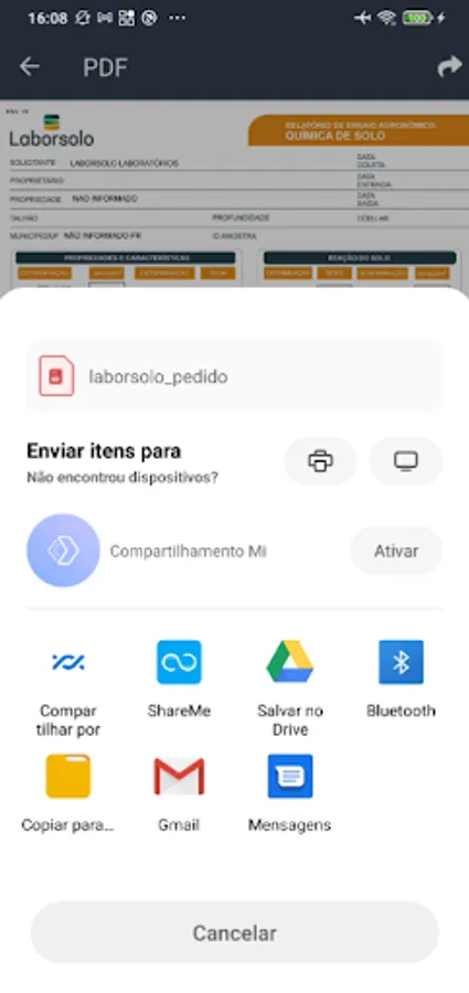 • Share the PDF file of your analysis. You will be able to share using the applications already installed on your device as an email client, messengers (such as WhatsApp and Telegram), bluetooth connection, DropBox, Google Drive, etc.