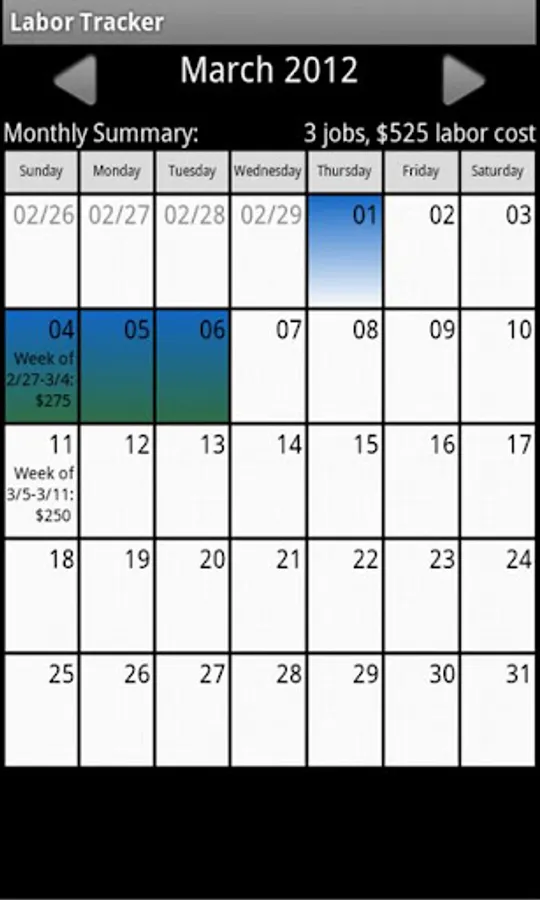 Labor Tracker gives you those options. Simply enter in a labor item complete with job name, city, employee name and paid amount and it will be stored in your app. The intuitive calendar control will then display days where you entered in labor items. And when you mark the people as paid, it will even display when everyone for that day has been paid. Long press on any day and you will be shown a popup of each employee and their labor cost for the day. Long press on a Sunday and you can view either employee labor costs for that day or for the prior week.