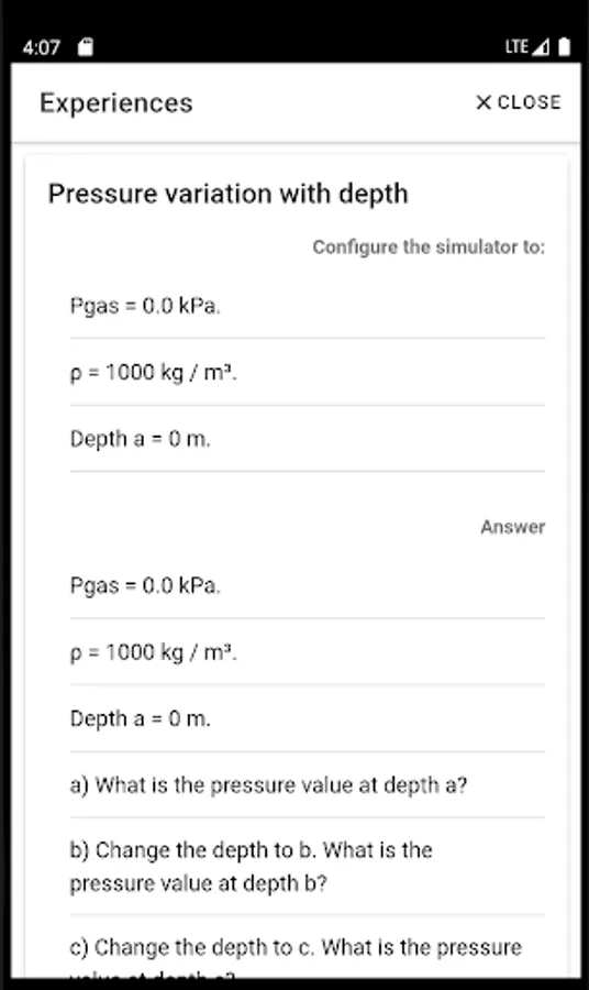 - Laboratory experiment script that allows you to check the pressure variation with depth;