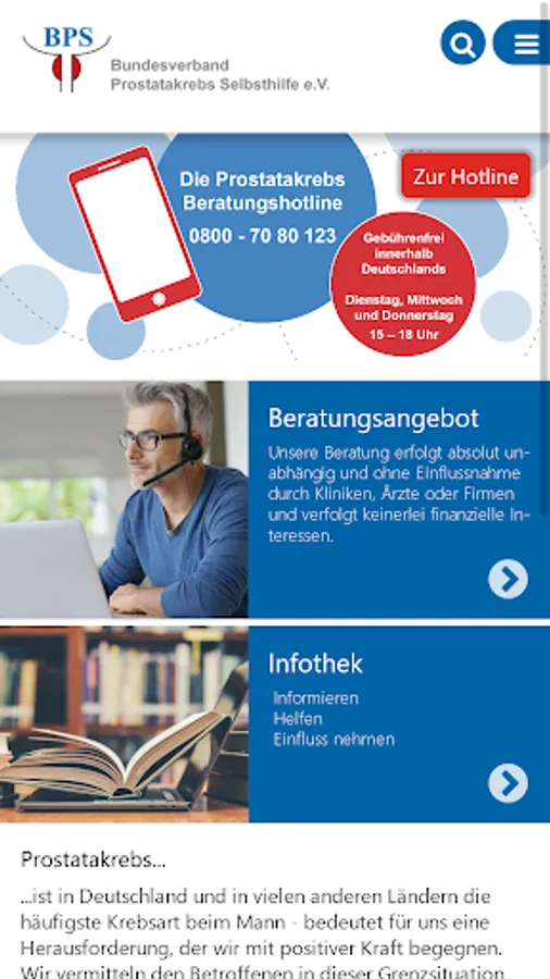To inform. Help. Influence. The Federal Association Prostate Cancer self-help e. V. was founded on September 15, 2000 as a merger of the then 18 self-help groups of prostate cancer sufferers in Germany. Out of these 18 have now become over 230 self-help groups. The BPS is a non-profit association supporting men who have prostate cancer and their relatives. The BPS has an influence on the health system and actively participates in it. The BPS Prostate Cancer App helps to facilitate communication with those affected, provides access to information and thus serves the person affected.