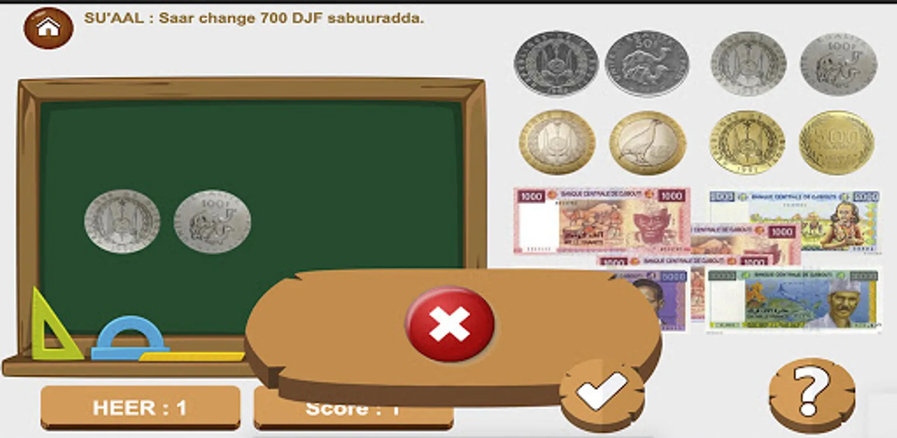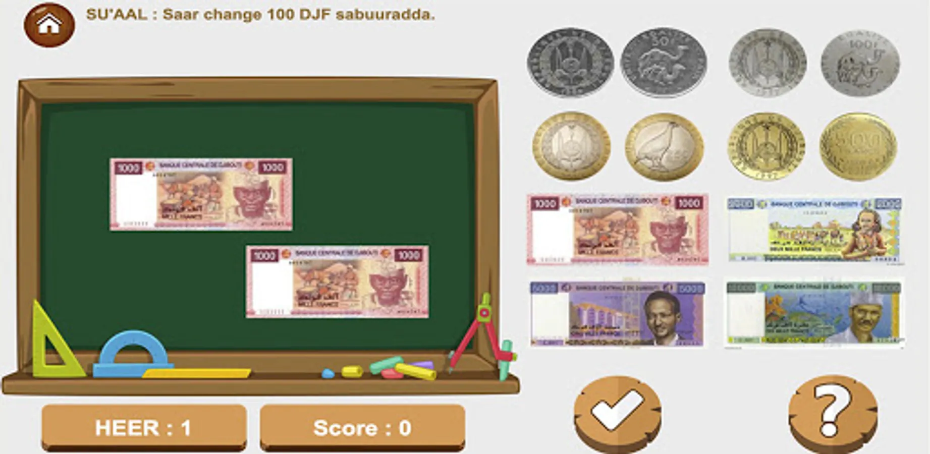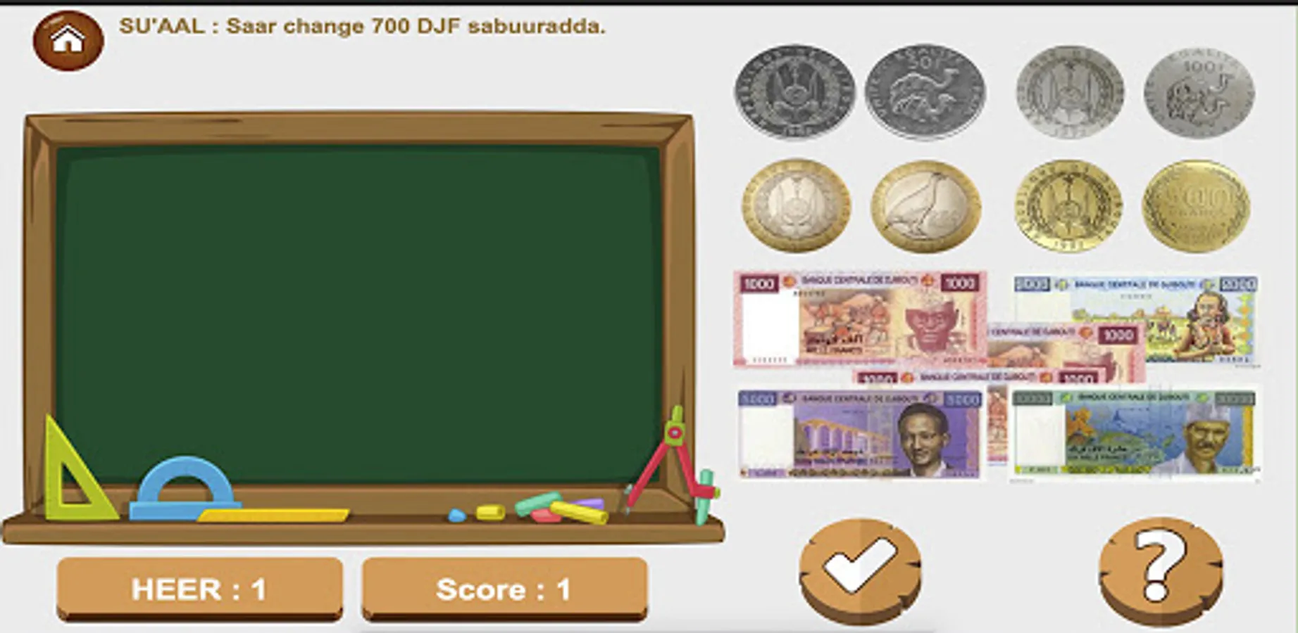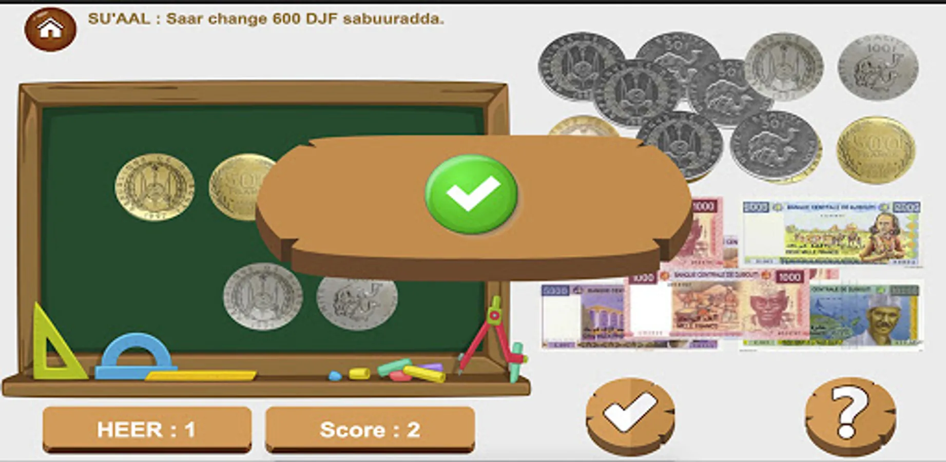 It is an educational and fun application that allows children to practice basic calculations (addition, subtraction, multiplication and division) by handling banknotes (Franc Djibouti DJF).
