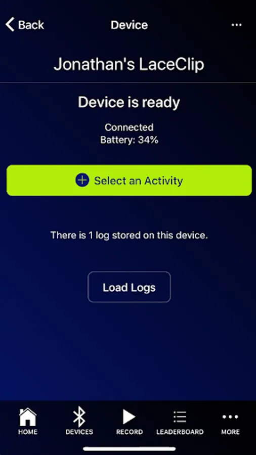 The LaceClips app connects to the LaceClips device - a wearable that attaches to your shoe laces - and allows users to choose from a range of supported activities and track their performance metrics.