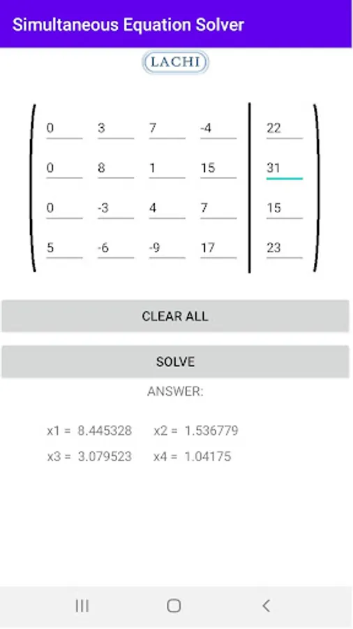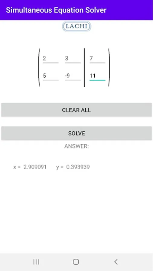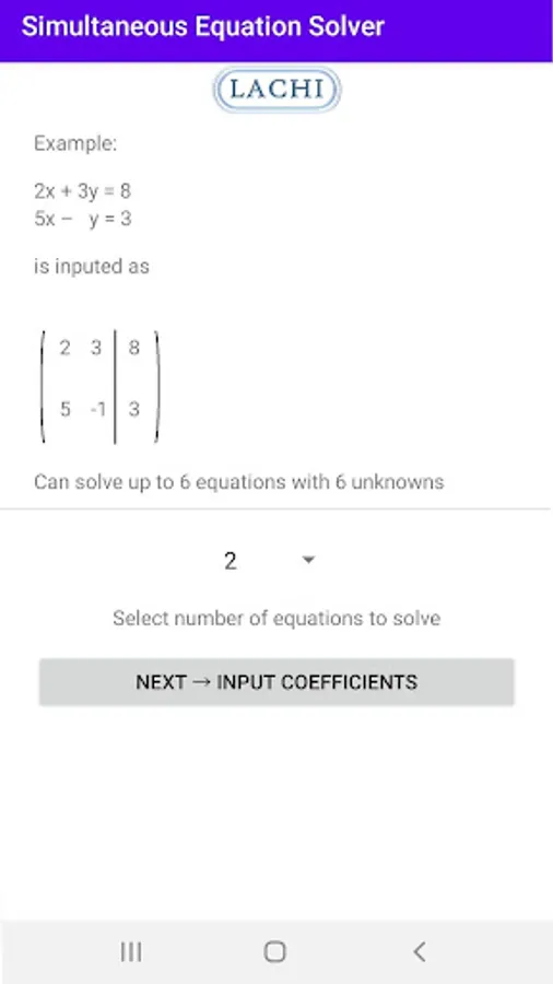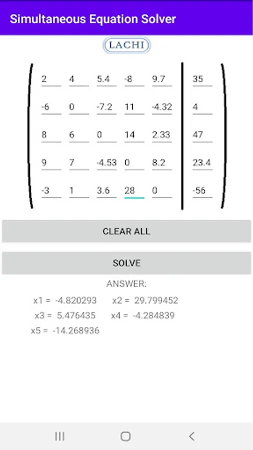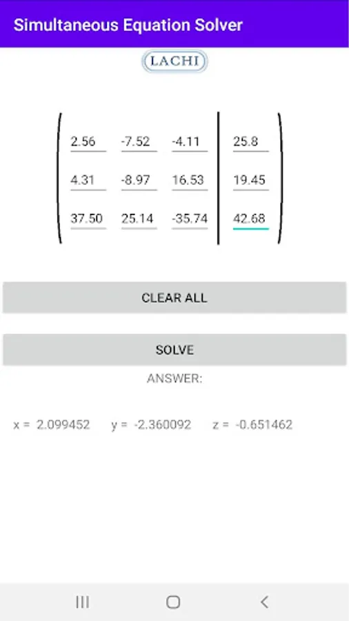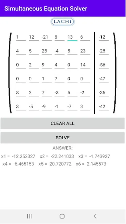 So from elementary two equations in two unknowns to complex six equations in six unknowns LACHI Simultaneous Equation Solver gives the user assurance of accuracy and ease of use in portrait and landscape.