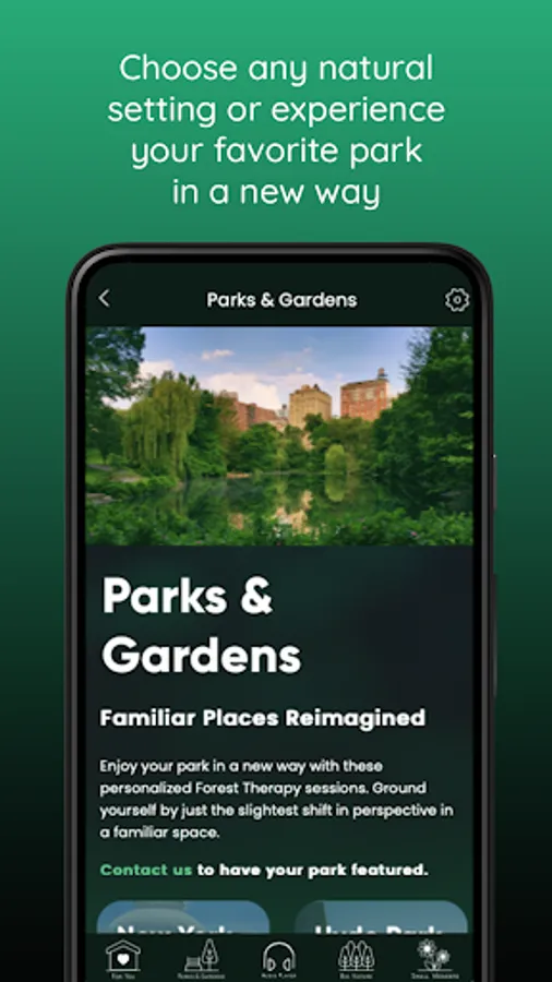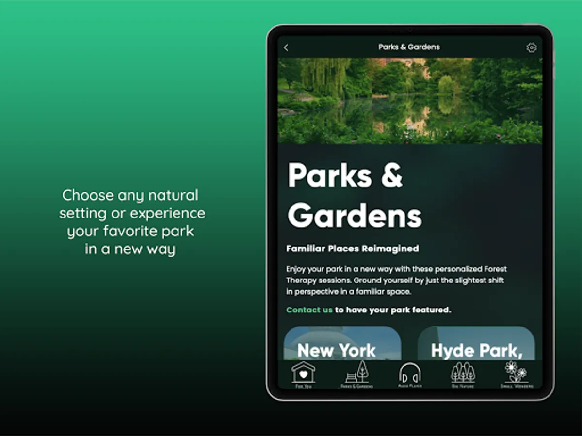 The TreeQuility App will conveniently locate any partnering parks or gardens and allow you to enjoy these spaces in a new, immersive way. Our curated sessions will transcend your experience beyond simply reading the same signs. You will be guided to use your senses to rediscover your go-to park or garden as you never imagined. Don’t see your favorite park or garden? Let us know at info@tree-quility.com as we would love to feature your favorite green space.
