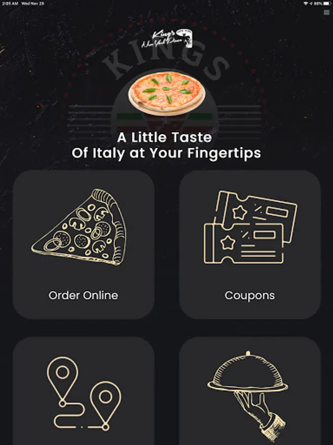 The Kings Pizza Martinsburg App is designed to enable the customers who enjoy dining at Kings Pizza in Martinsburg, West Virginia. The app will allow our customers to order food, delivery, get exclusive coupons, and even put in catering orders!