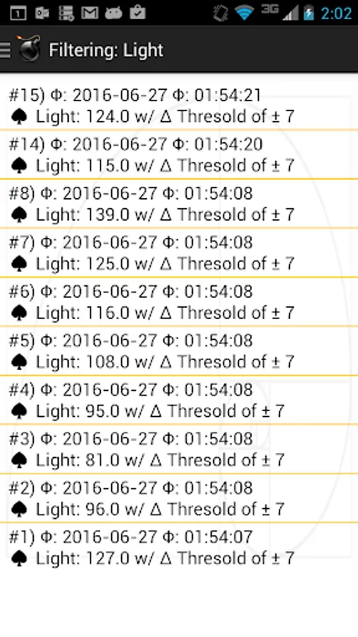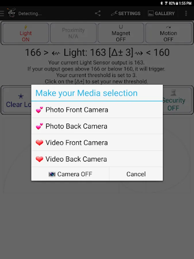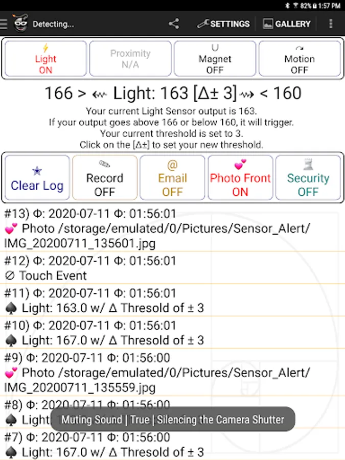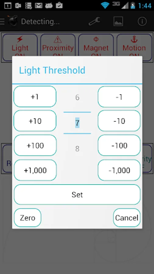 For Example: Light Sensor Output is currently 307 with a threshold of 3. If the light Sensor moves above 310 [307+3] or below 304 [307-3], it will trigger an event. Real Life Example: You can leave your phone on top of your refrigerator with the Light Sensor set at Zero; When someone comes into the kitchen and opens the light it will trigger the light event. This event can be emailed to you along with captured photos or videos.