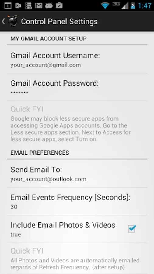 All Photos {JPG} and Videos {MP4} are automatically emailed regards of Email Events Frequency. {after setup}
