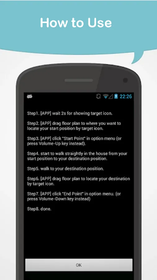 Step2. Click "Start Point" in option menu (or press Volume-Up key instead) to locate your start position. Then, please walk in a straight line to your destination position.